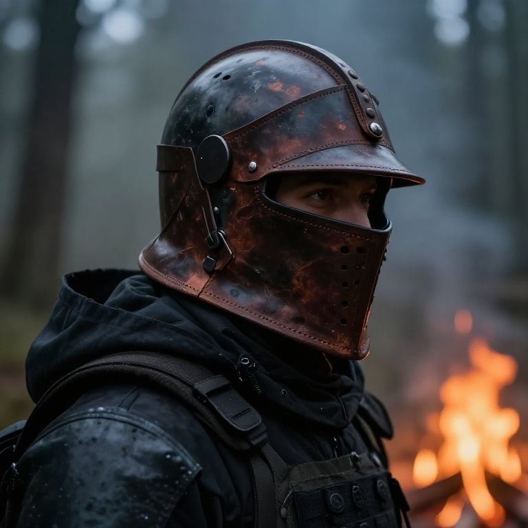 Over the helmet hood crafted from weathered leather and dark fabric, blending medieval knight aesthetics with modern tactical gear, illuminated by flickering campfire light in a misty forest environment.