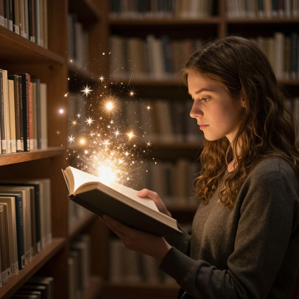 Photograph of a young woman with long brown hair, wearing a gray sweater, reading a book in a library, surrounded by magical, glowing sparks.