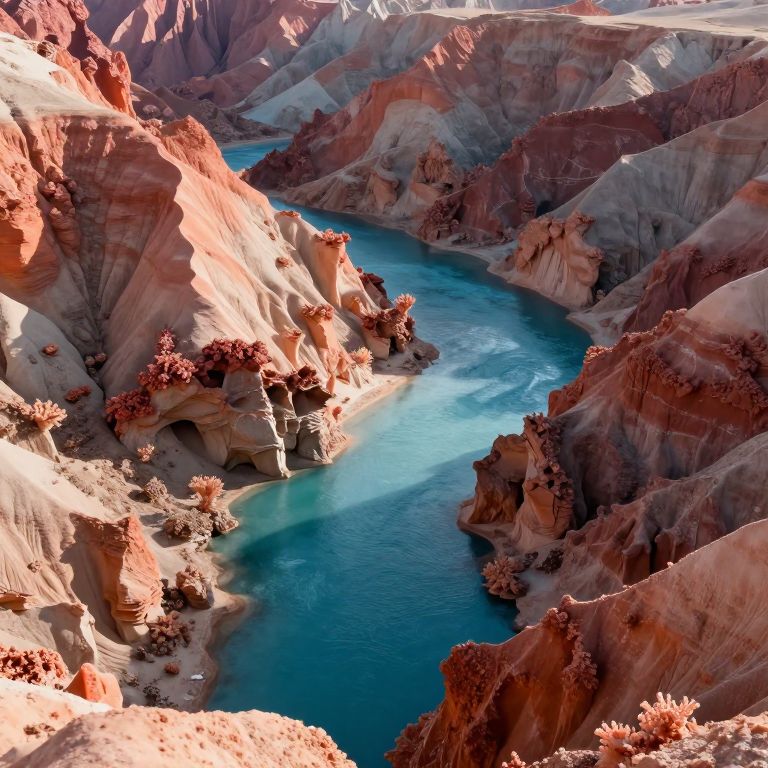 An ethereal journey through a surreal landscape of coral-hued peaks and azure waters, where the interplay of light and shadow whispers of infinite possibility, inviting contemplation and wonder.