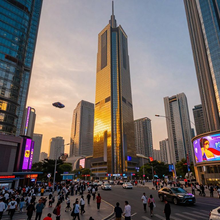 Photograph of a bustling urban intersection at sunset, featuring a tall, golden-hued skyscraper surrounded by modern buildings, crowds, and neon signs.