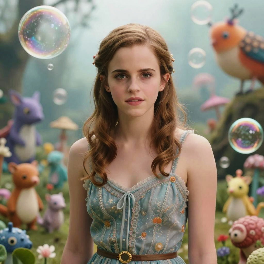 A whimsical portrait of Emma Watson in a colorful, dreamlike setting, surrounded by floating bubbles and whimsical creatures. Soft, diffused lighting with smooth focus, conveying a sense of ethereal beauty. Inspired by the works of Tim Walker, Annie Leibovitz, and David LaChapelle. Preferably a high-resolution image that captures the intricate details of the scene.realistic, best quality, photo-realistic8k, masterpiece, realistic, photo-realistic