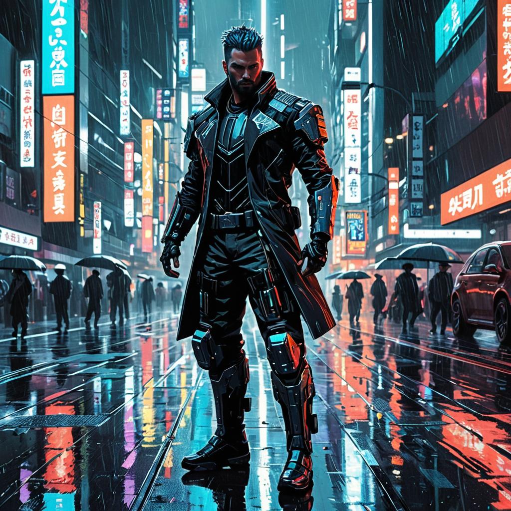 A very detailed illustration of a futuristic ninja as a neo-Tokyo cyberpunk, with digital tattoos and alloy armor, rainy neon skyline, intricate high-quality design