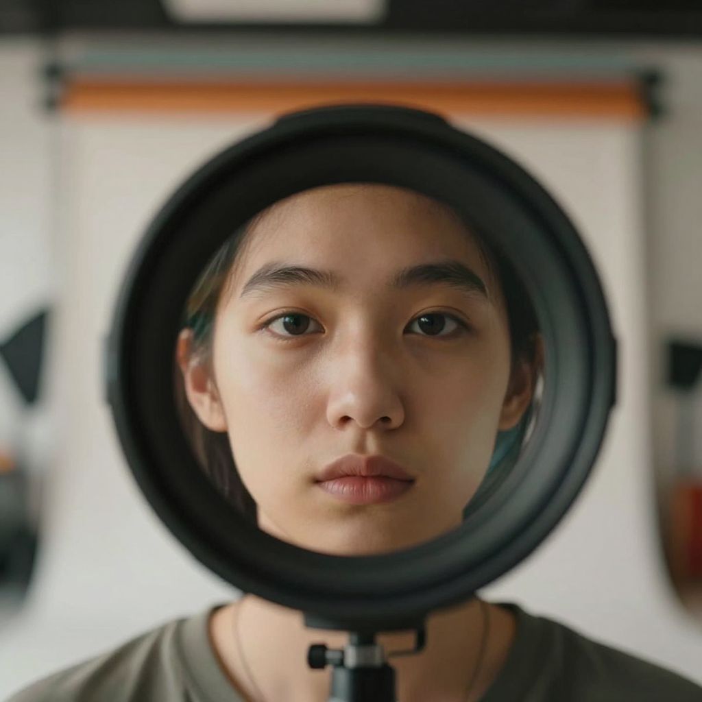 Photograph of a young Asian woman with medium skin tone, straight black hair, and brown eyes, centered in a close-up shot through a black ring light. She has a neutral expression with slightly parted lips. She wears a greenish-gray shirt. The background is blurred, featuring white and dark colors, with indistinct shapes and an orange horizontal strip near the top. The ring light is mounted on a black stand, focusing attention on her face. The image has a soft, natural light, highlighting her features and creating a slightly warm tone.
