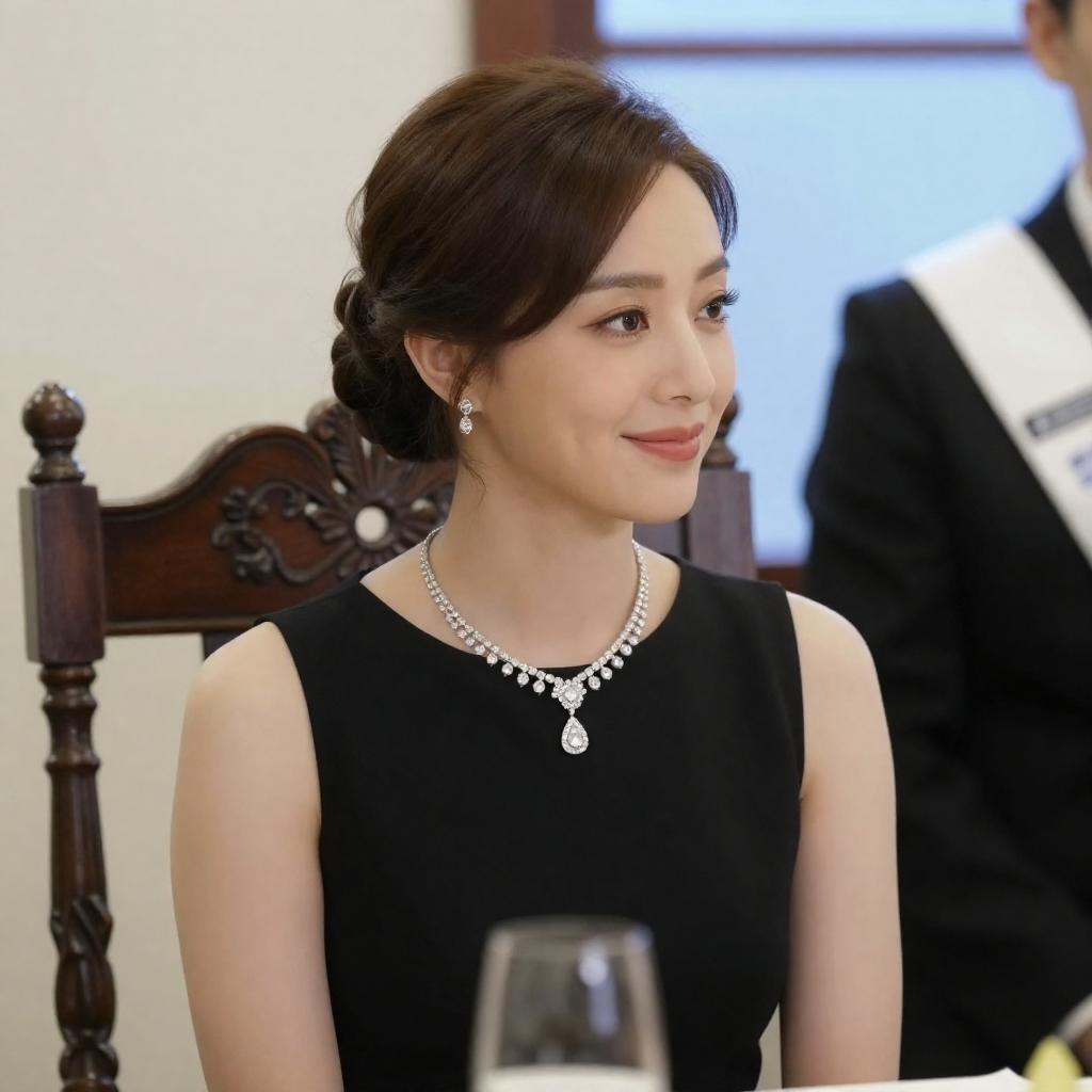 Photograph of a woman with light skin and brown hair in an elegant updo, wearing a black sleeveless dress and a diamond necklace. She smiles slightly, looking to the right. Background includes a wooden chair with carved details and a blurry blue window. A person in a black and white uniform is partially visible on the right. Glass in the foreground.