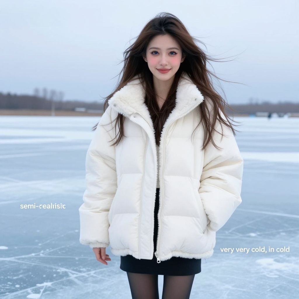 ((((white Oversized shearling down jacket)))), ((((white Oversized shearling puffer jacket)))), ((((white Oversized shearling winter clothes)))), ((((very very cold, in cold)))), ((((semi-realistic)))), ((((feet out of frame)))), ((((puffer hood)))), ((medium knee office skirt, pantyhose, boots)))), ((sharp eyelid, eyeliner, eyelashes, beautiful detailed eyes, tsurime, long messy brown hair, blue eyes, perfect anatomy)), smile, standing, icefield, ((((masterpiece)))), ((((best quality)))), ((intricate details)), RAW, 8K UHD, (1girl), office lady, detailed face, beautiful face, charming, bonny, (((blush))), (((heavy breathing))), (((feels orgasm))), wind, (Thick padded collar:1.4), (TSH:1.4), (Thick padded cuffs:1.4)