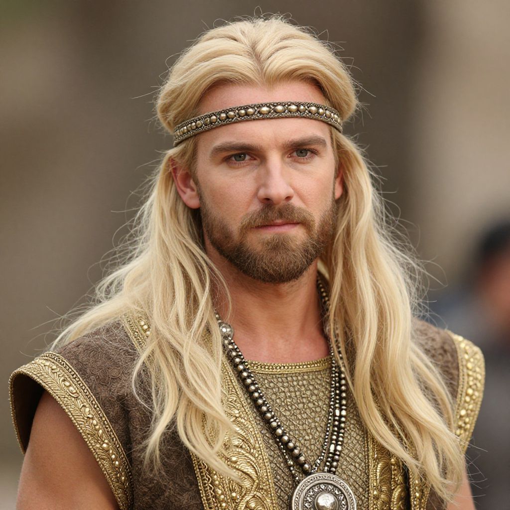 Krish costume, 1boy, male focus, solo, headband, outdoors, necklace, long hair, beard, facial hair, jewelry, blurry background, blurry, blonde hair