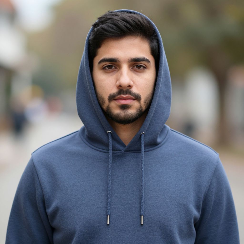 Photograph of a young man with medium brown skin and dark, neatly styled hair and a trimmed beard. He is wearing a navy blue hooded sweatshirt with the hood up, covering his head. His expression is neutral with slightly parted lips. The background is blurred, showing an outdoor urban setting with indistinct buildings and trees. The lighting is natural, suggesting daylight. The focus is sharp on his face, highlighting his features and the texture of his sweatshirt.