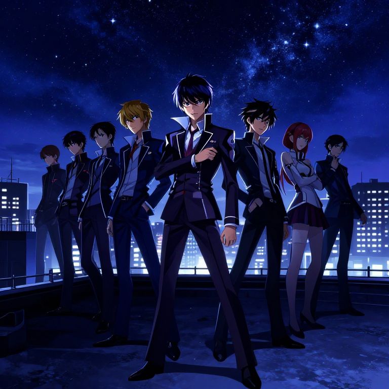 This digital anime-style illustration features a group of eight characters standing on a rooftop at night, illuminated by city lights and a starry sky. The central figure, a confident young man with black hair and a black suit, stands front and center with a serious expression. Flanking him are seven other characters, including men in suits and women in formal attire, with varied hair colors from brown to red. The background showcases a cityscape with lit buildings and a cosmic sky. The color palette is dominated by deep blues and blacks, emphasizing a nocturnal, mysterious atmosphere.