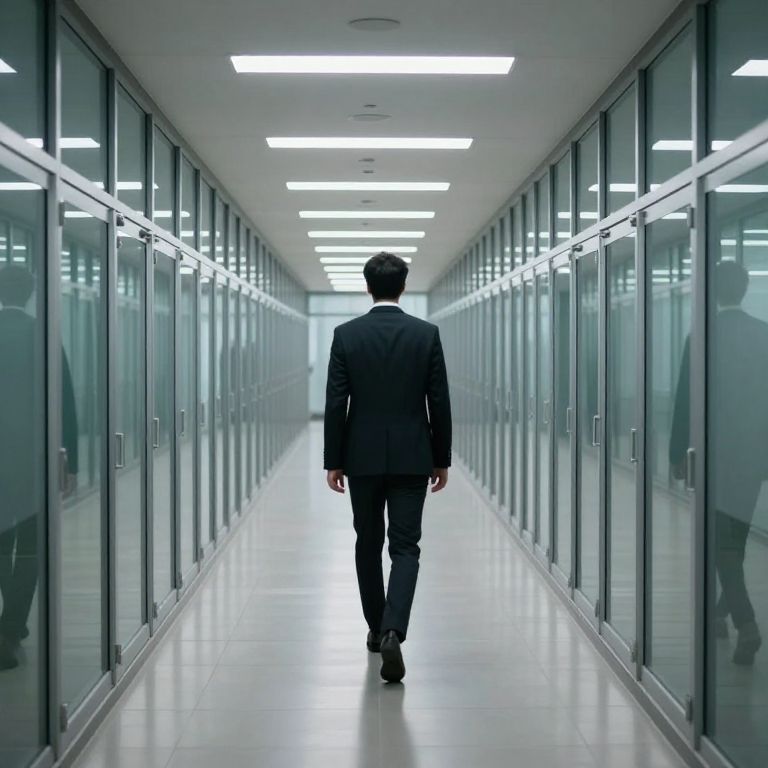 A photograph of a man walking down a long, narrow, fluorescent-lit hallway with glass-paneled walls on both sides, creating a mirrored effect. The man, viewed from behind, wears a dark suit and black shoes, with short, dark hair. The hallway's glossy, white-tiled floor reflects the ceiling lights, enhancing the sterile, modern atmosphere. The perspective draws the eye towards a bright, distant end of the corridor, suggesting a path forward or a destination. The image conveys a sense of solitude and corporate environment.