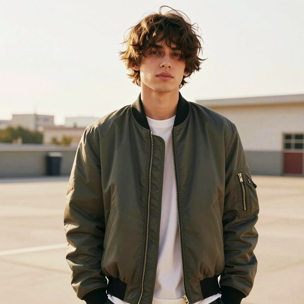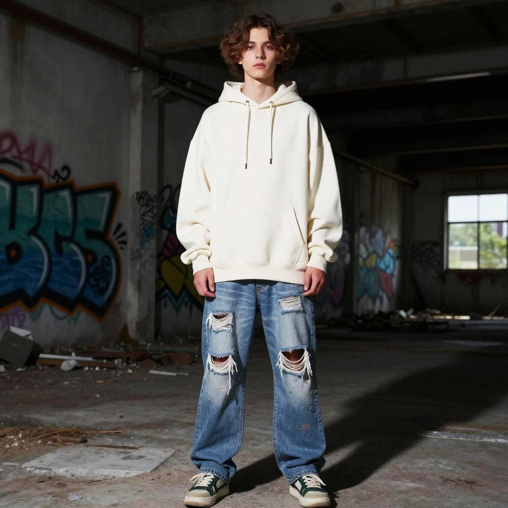 A high-end editorial photograph of edgy street dancer striding a couture runway in abandoned urban rooftop at dusk with graffiti walls and soft mist, wearing oversized leather jacket with graphic tee, ripped skinny jeans, and high-top sneakers. Strong key light from the left casts crisp highlights and a dark-to-light gray gradient across a minimalist backdrop; full-body framing, clean shadows, reflective floor, ultra-detailed textures, futuristic yet elegant mood, minimal props, balanced color, high contrast, magazine-cover energy.