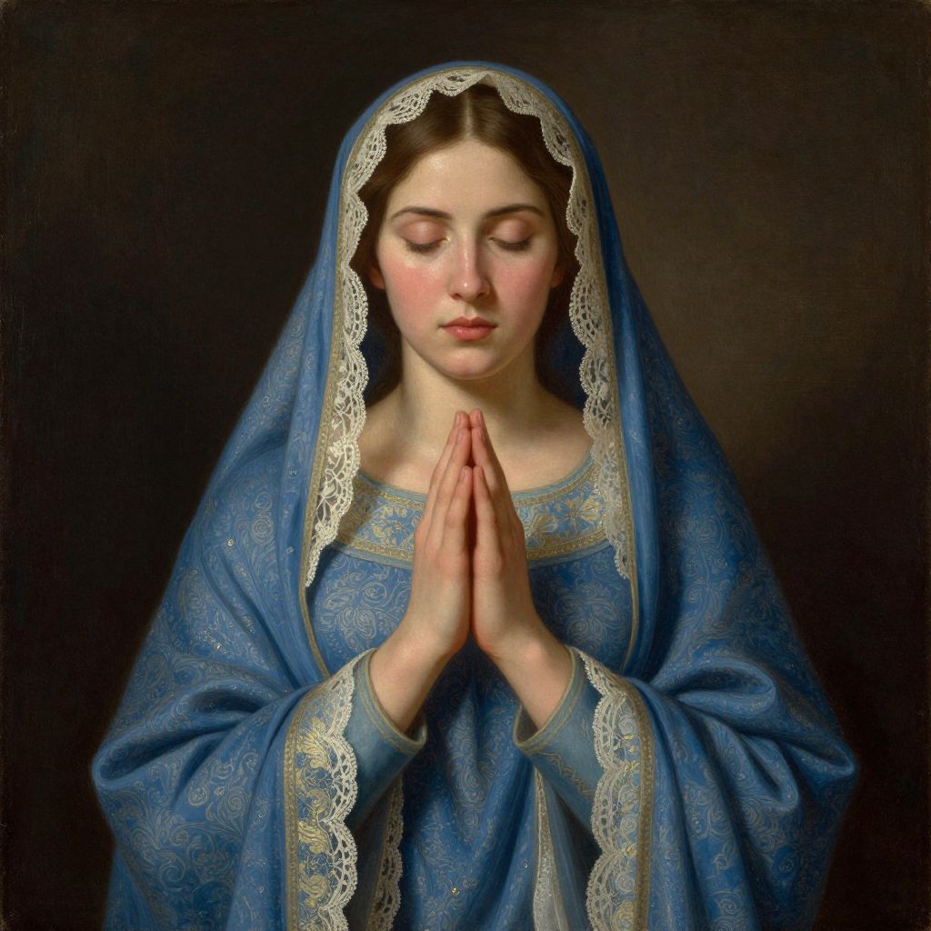 In this captivating painting, a woman is depicted in a moment of profound prayer, her hands clasped together in front of her chest. She is adorned in a rich, blue robe with intricate patterns, draped over her shoulders and cascading down her arms. A delicate lace headscarf covers her hair, adding a touch of elegance and modesty to her appearance. The woman's eyes are closed, and her expression is one of deep contemplation and reverence.