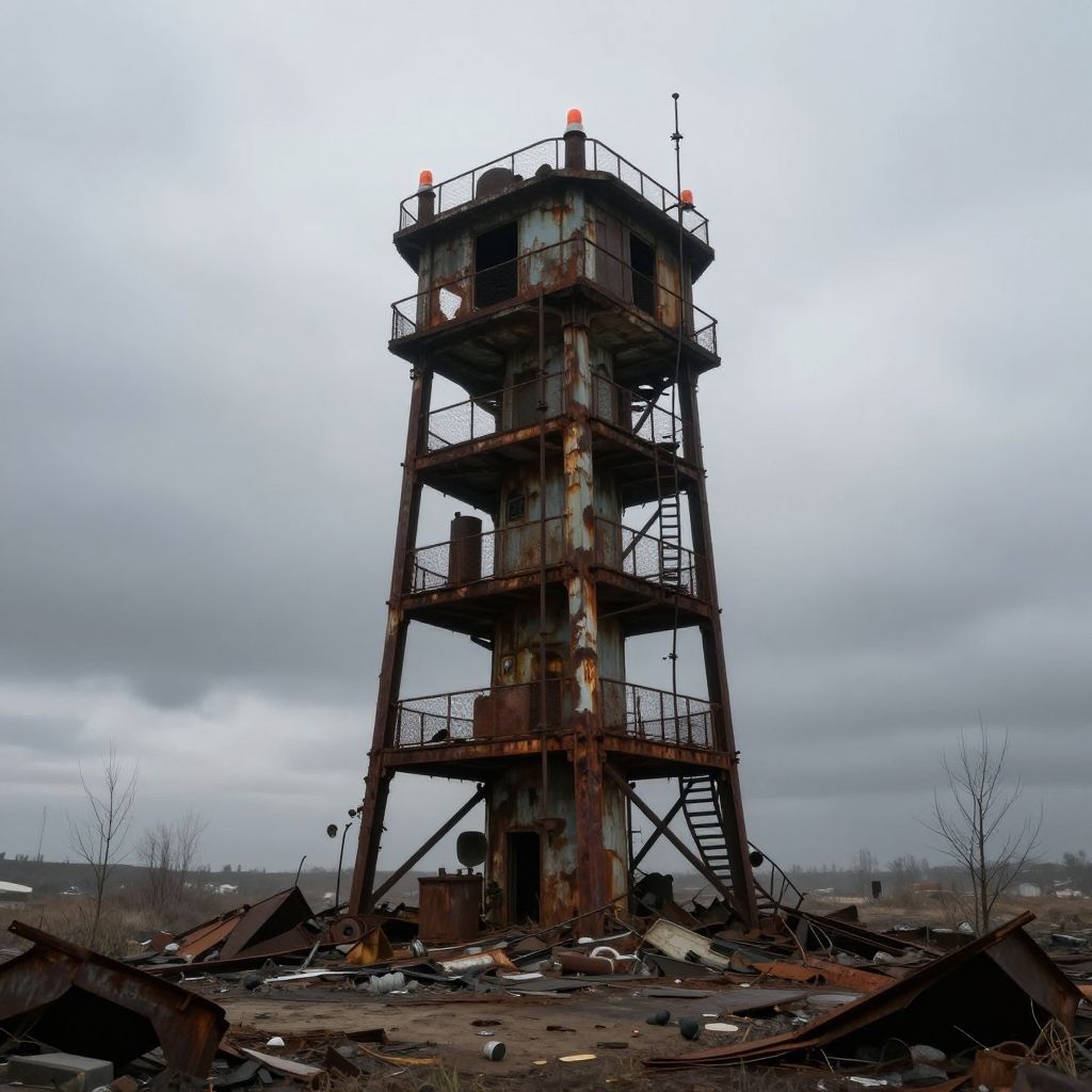 Evac tower amidst a post-apocalyptic wasteland, rusted and weathered structure with flickering warning beacons, desolate landscape with scattered debris, overcast sky conveying tension