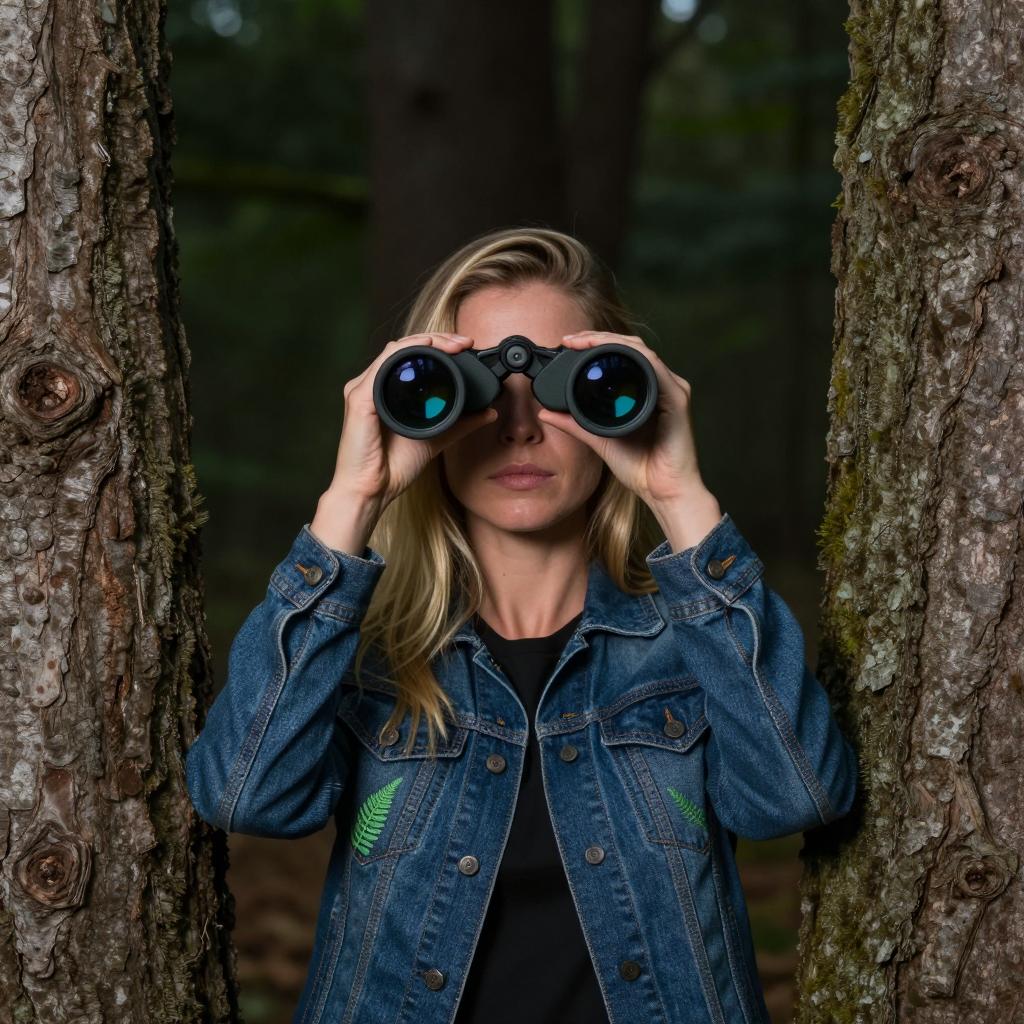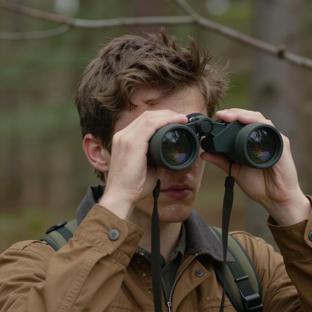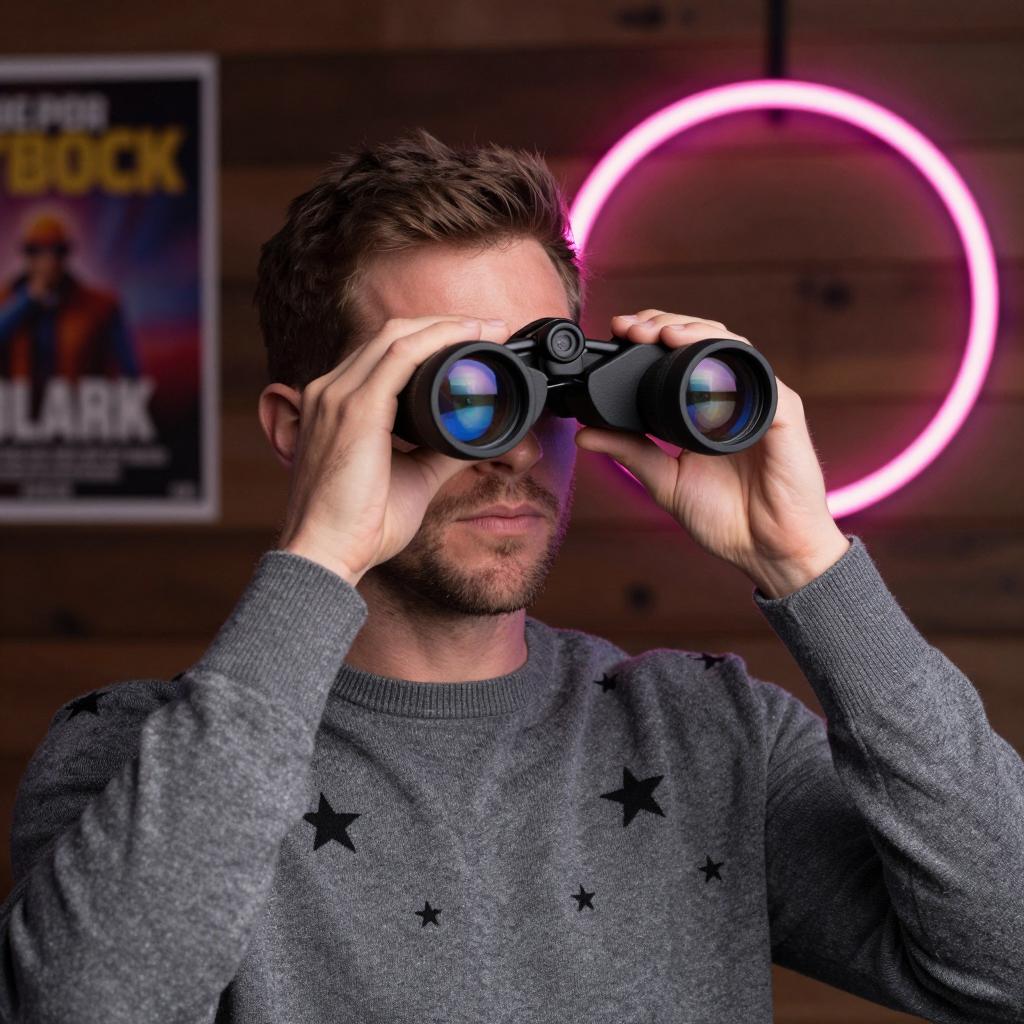 Man with short brown hair, wearing a gray, star-patterned sweater, holds black binoculars to his eyes. Neon pink circle light is in the background to the right. Dark wooden wall and blurry poster are on the left. Man's face is partially obscured by binoculars.