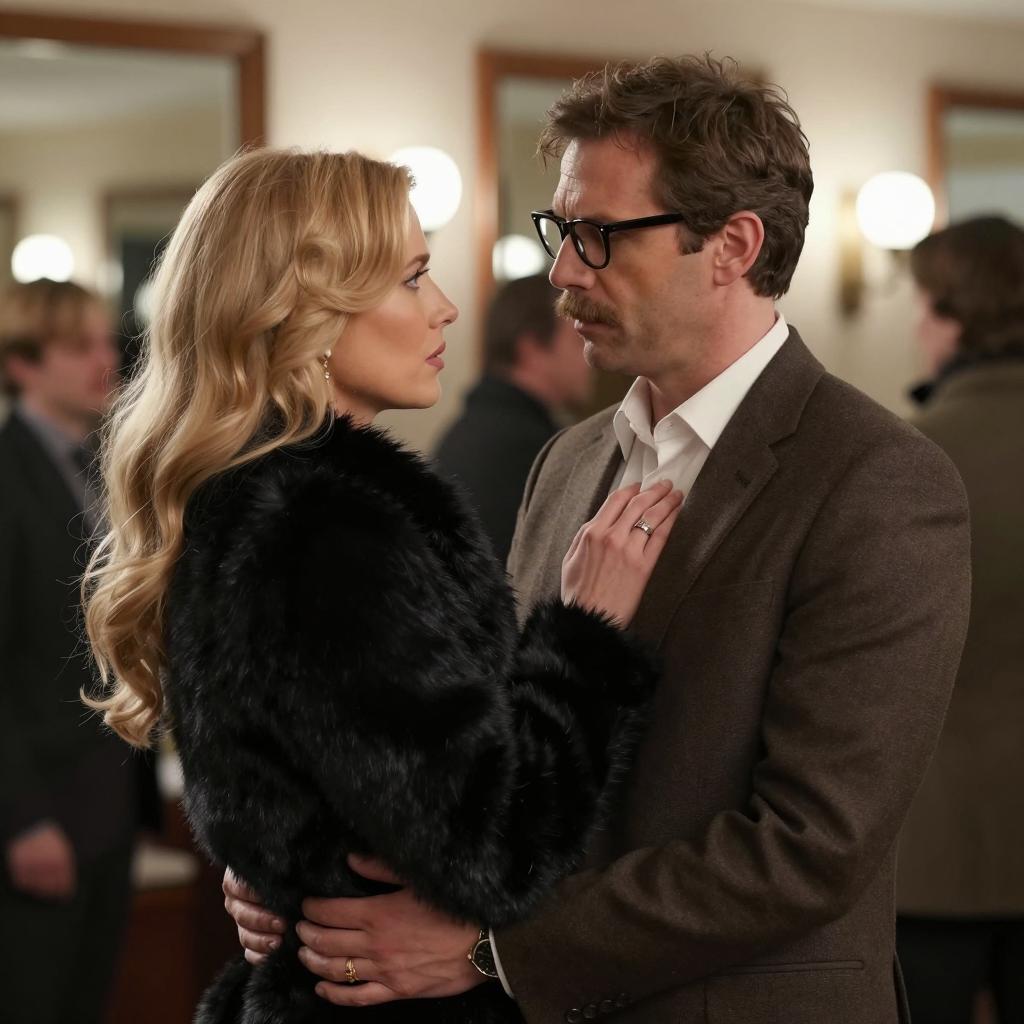 A man with glasses, mustache, and brown suit holds a blonde woman in a black fur coat. They stand close, faces showing concern. Background has blurred people, lights, and mirrors. Two people total. Woman's right hand on man's chest. Indoor setting.