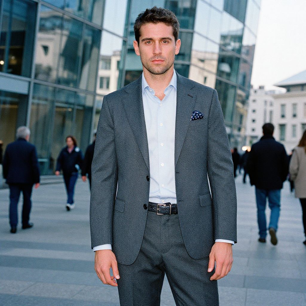 A man, charcoal gray slim fit suit, light blue dress shirt, patterned pocket square in navy, suede loafers, textured leather belt, modern glass structure, reflective surfaces, bustling plaza, kodacolor analog film, confident expression. Man has masculine face and piercing eyes
