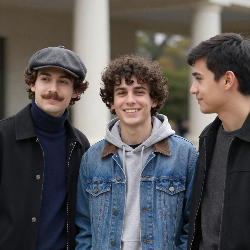 Photograph of three young men. Two men on left and right, one man in the center. Left man with curly mustache, gray flat cap, black jacket, blue turtleneck. Center man with curly hair, denim jacket, gray hoodie, smiling. Right man with short black hair, black jacket, looking at center man. Background with blurred columns and trees. All men smiling. Casual outdoor setting.