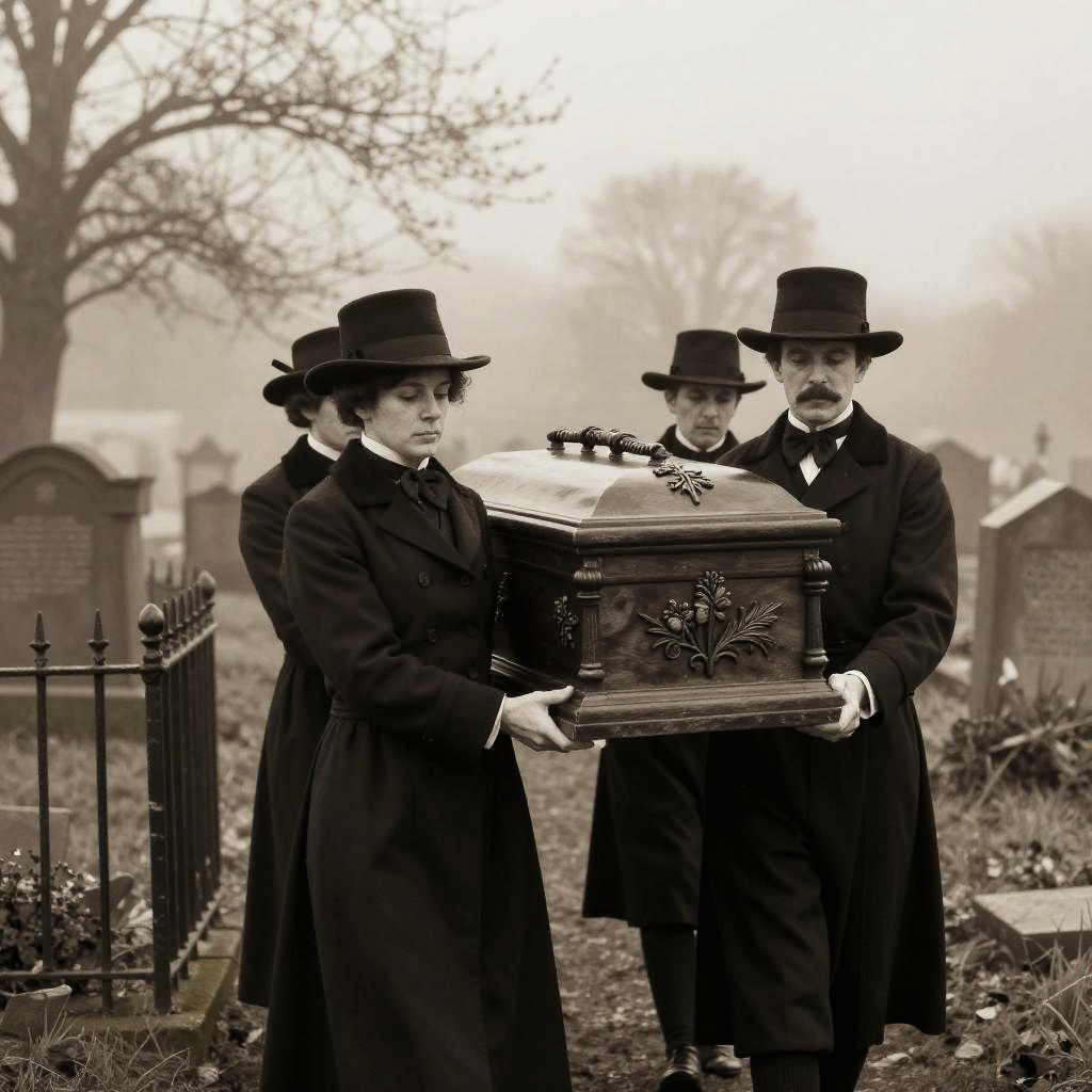 A group of pallbearers in vintage Victorian attire, bearing an ancient casket adorned with floral carvings, set against a fog-covered graveyard with wrought iron fences, muted sepia tones, melancholy ambiance, rich textures and historical accuracy.