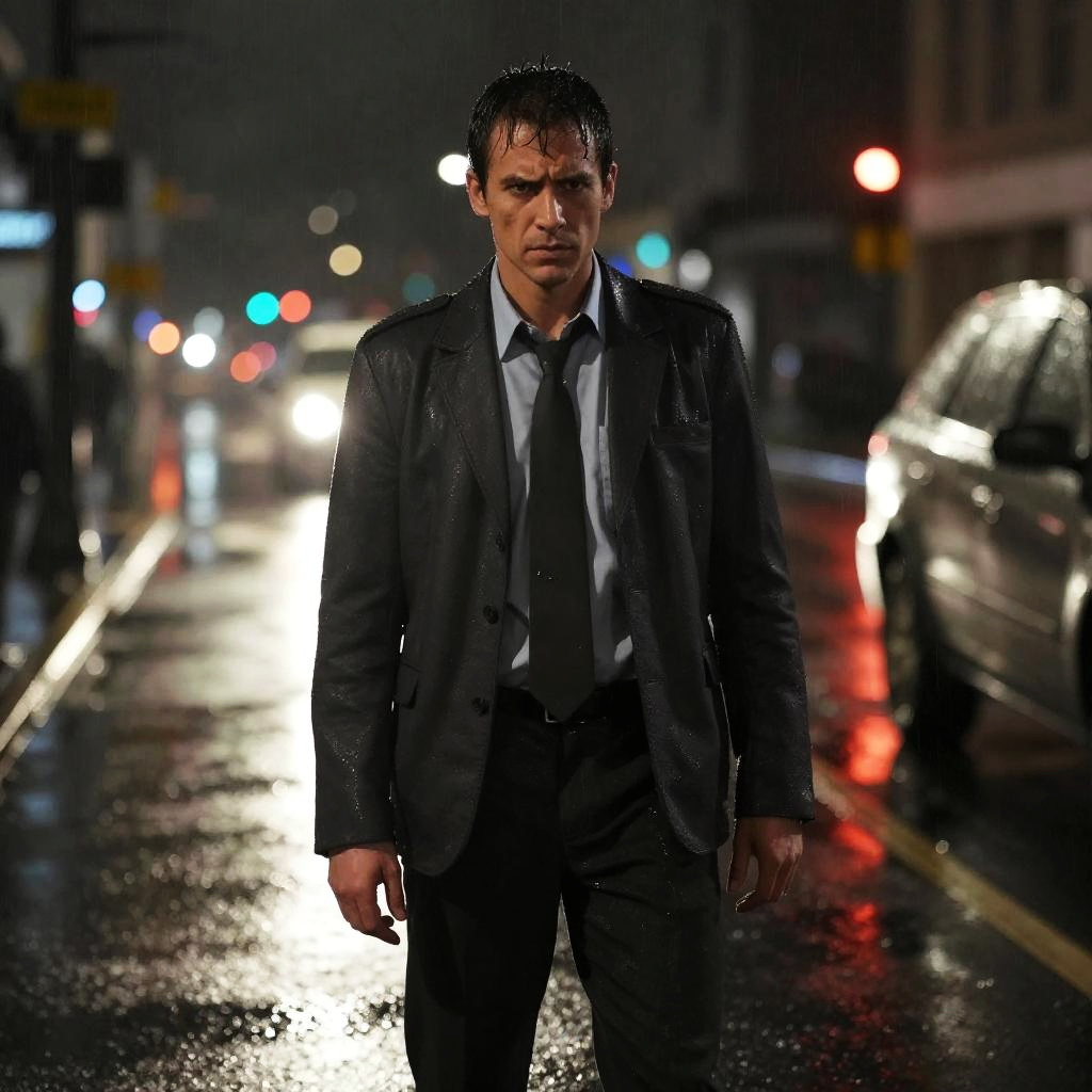 Noir comic style portrait, intense close-up of detective with stubble and fedora, half-lit face with rain droplets, gritty texture, dramatic and mysterious expression