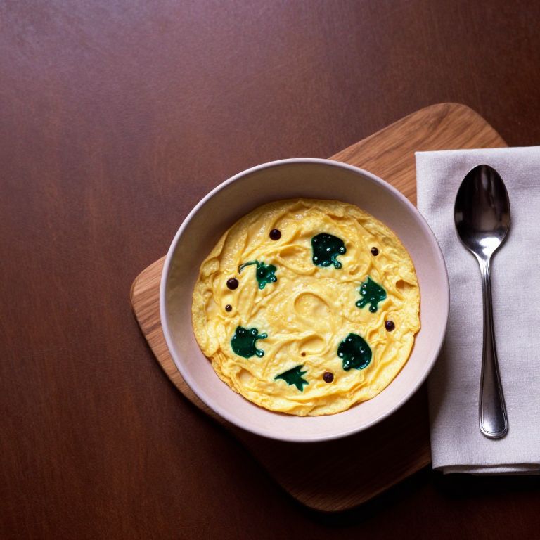 Negative Space an omelet bowl next to wooden napkin and silverware, in the style of light magenta and dark bronze, dark yellow and dark emerald, mushroomcore, frogcore, ilford pan f, velvia, ue5,
