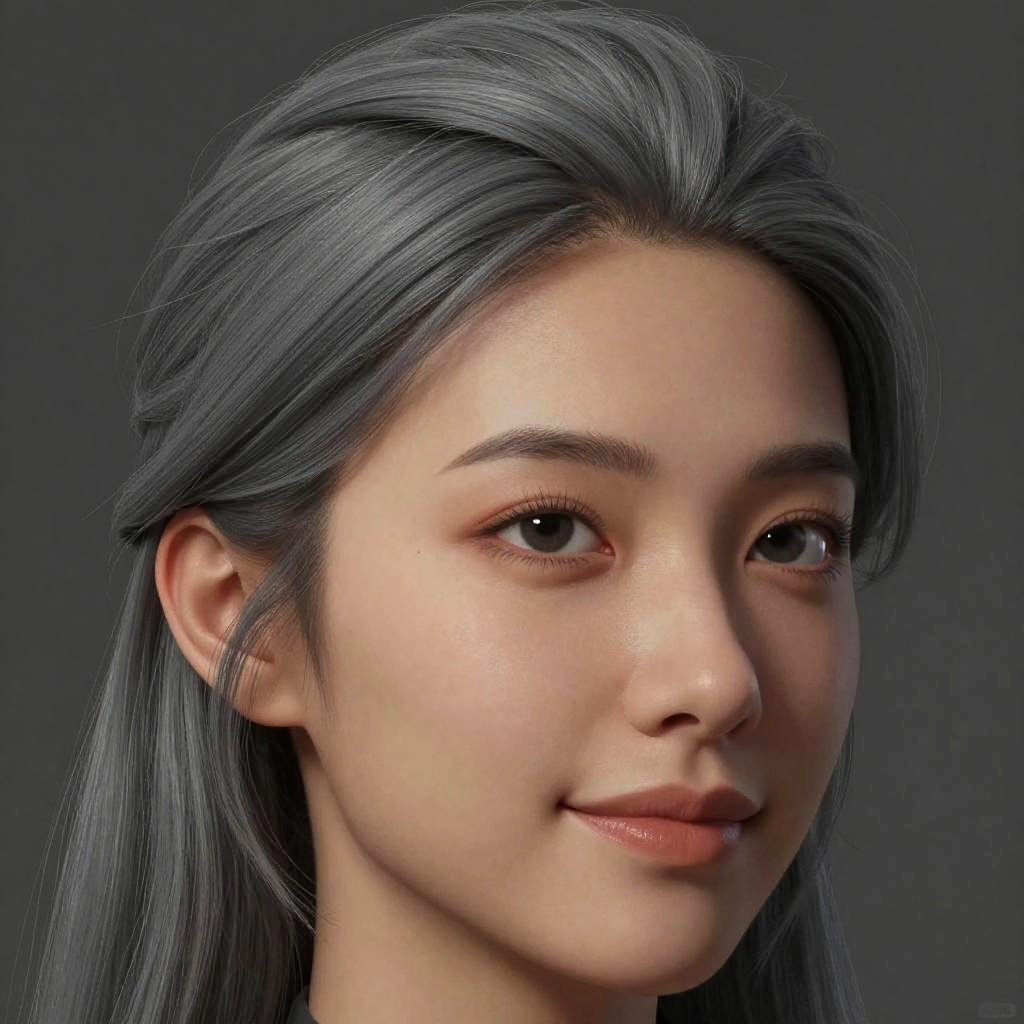 What would I look like with gray hair? Close-up of a thoughtful person with smooth gray locks, intricate hair texture, warm skin tones, soft shadows, slight smile, professional studio lighting, realistic digital painting with fine detail and depth.