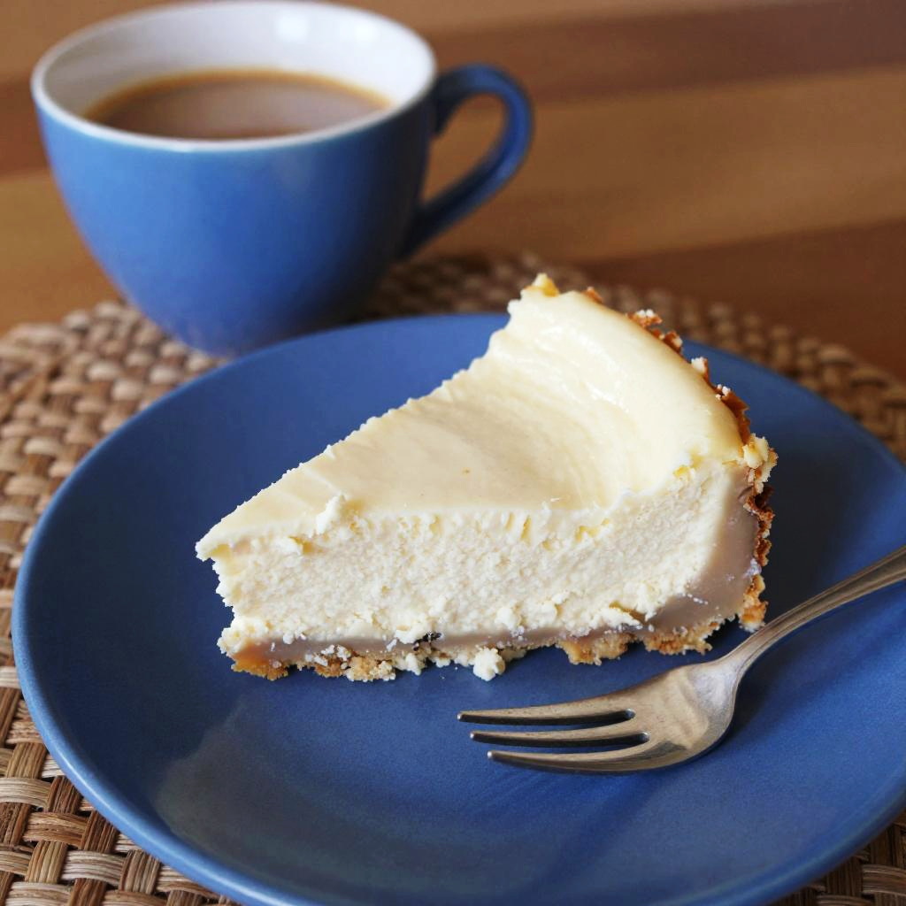 A close-up photograph of a blue ceramic plate with a slice of creamy, crumbly white cheesecake. The cheesecake has a rough texture and a small bite taken out of it. A silver fork rests on the plate's right side. In the background, a blue ceramic cup filled with a brown liquid sits on a wooden table covered with a brown, woven placemat. The image has a warm, cozy feel.