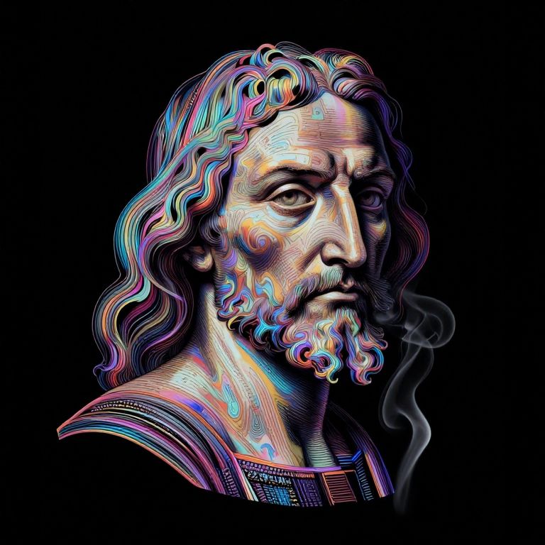 Machine Quilting iridescent line streak of color smokes the portrait of Vitruvius, black background, Landscape wallpaper in high definition 4k,