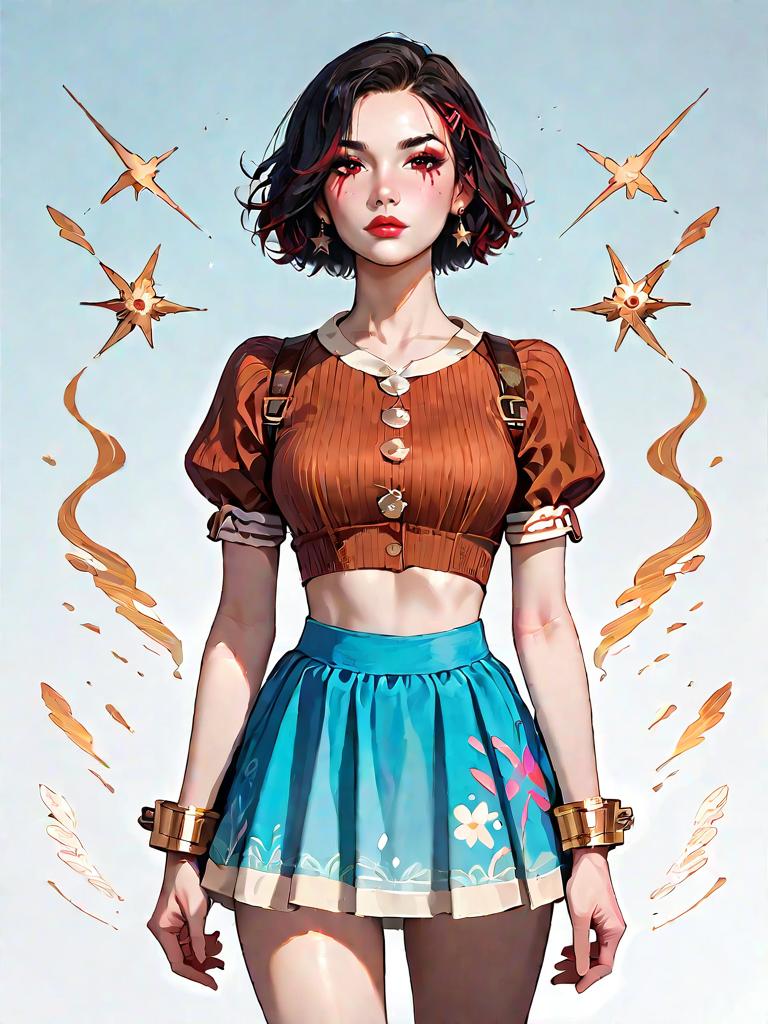1girl, source_comics, realistic face, full body shot, Woman, trendy fashion, brown crop top with lace-up detail at the front, short puff sleeves, maroon ribbed asymmetrical mini skirt, gold cuff bracelet on one wrist.