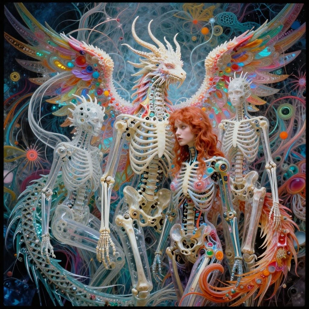 Digital fantasy art: Red-haired woman with ethereal wings, surrounded by glowing, colorful skeletal dragons in a vibrant, cosmic background.