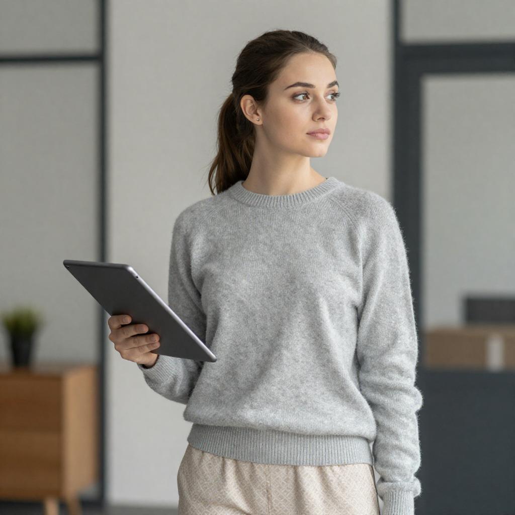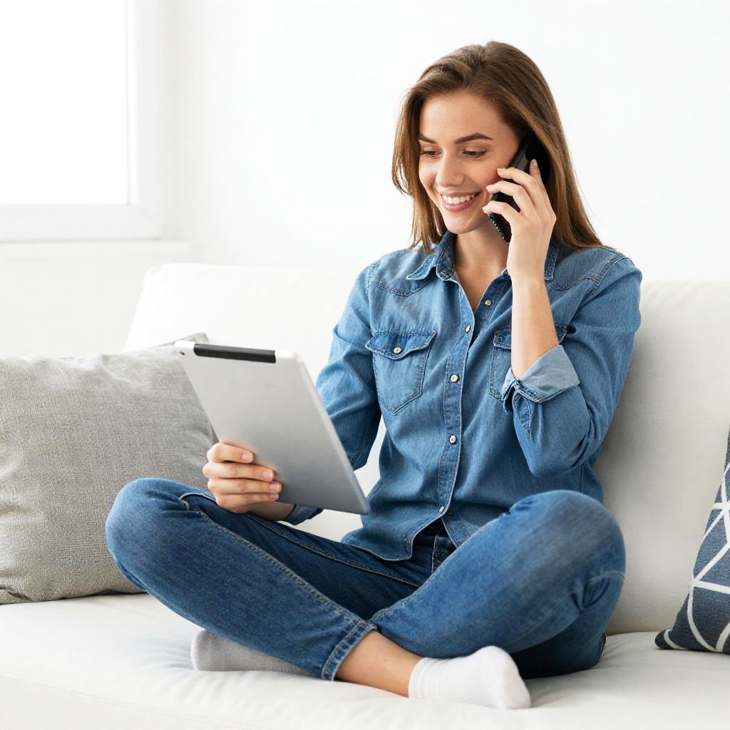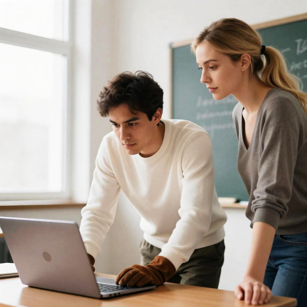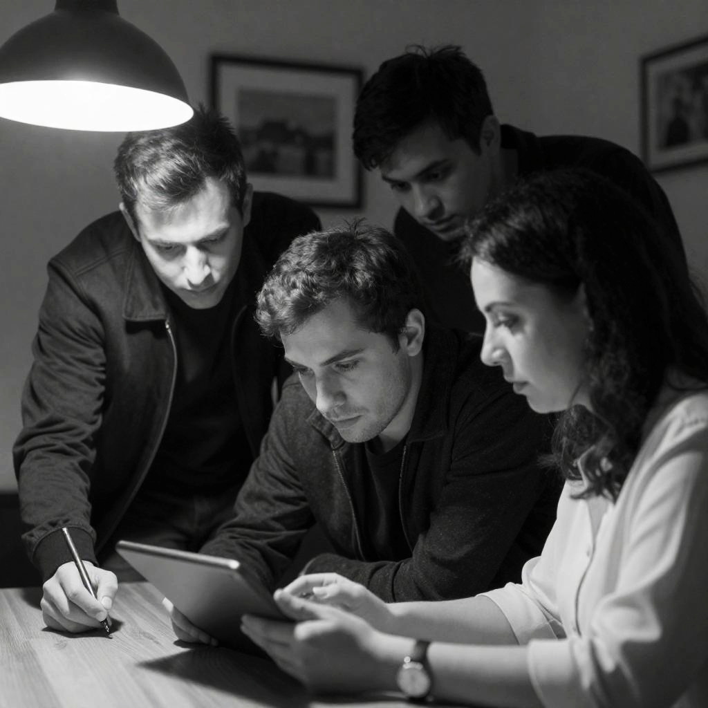 Two men sitting at a table, focused on a tablet. The man on the left has short dark hair, a serious expression, wears a navy shirt, and holds the tablet. The man on the right has short hair, a concentrated expression, wears a gray shirt with an American flag patch, and points at the tablet. The table has cards scattered on it. Bright background.