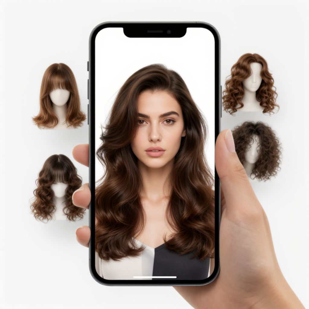 App try on virtual hairstyles visualization showing a stylish woman using a virtual try-on app with floating hairstyle options around her head, dynamic lighting effects, photorealistic rendering of hair strands, modern design aesthetic, clean tech UI.