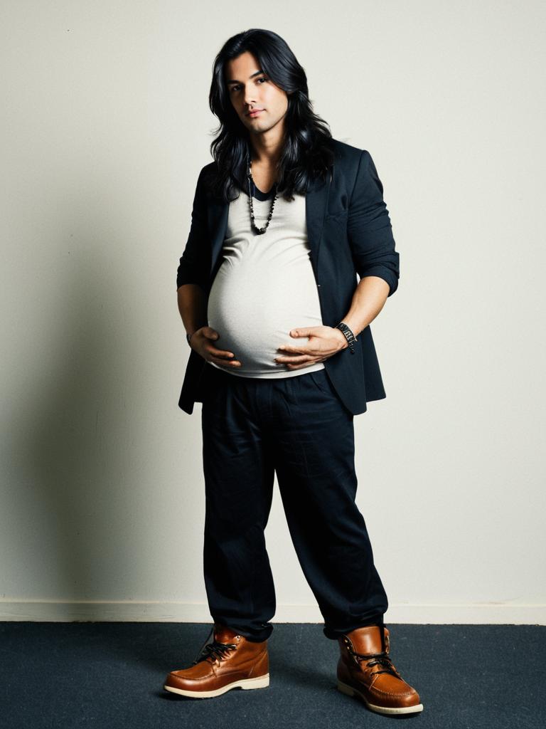 Portrait of a young South Asian man with long black hair standing against a plain background. He is wearing a black blazer, white shirt accentuating a pregnant belly, black pants, brown leather shoes, and a beaded necklace. The man is looking at the camera with his hands resting on his belly.
