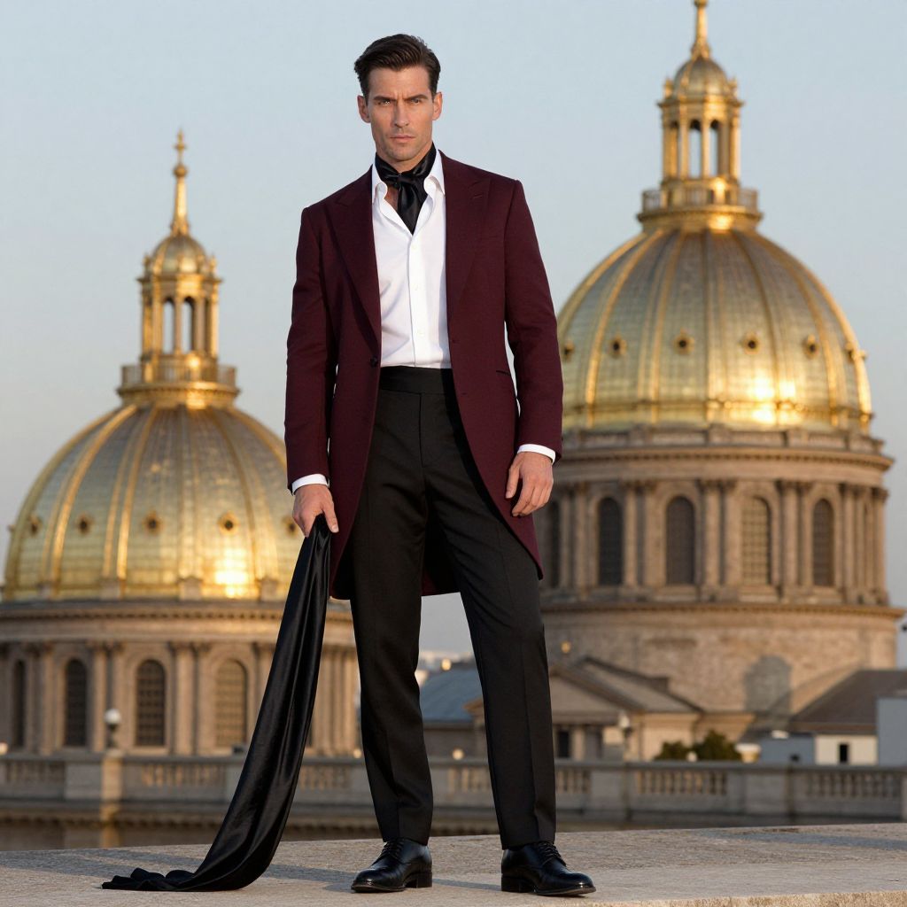A man, rich burgundy tailcoat, white dress shirt, black silk ascot, fitted black trousers, polished black brogues, black silk scarf cascading down, majestic domes reflecting golden sunlight, eastman film stock, confident expression, poised and elegant. Man has masculine face and piercing eyes