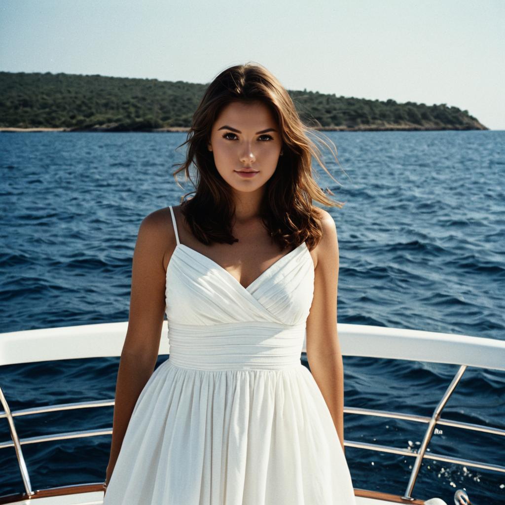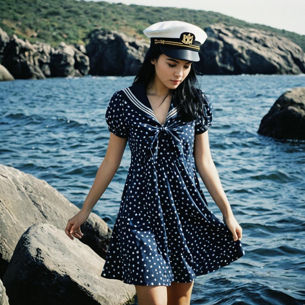 Young woman with long black hair wearing a navy blue sailor dress with white polka dots and a white captain's hat, standing on rocky shore with ocean and green hills in the background.