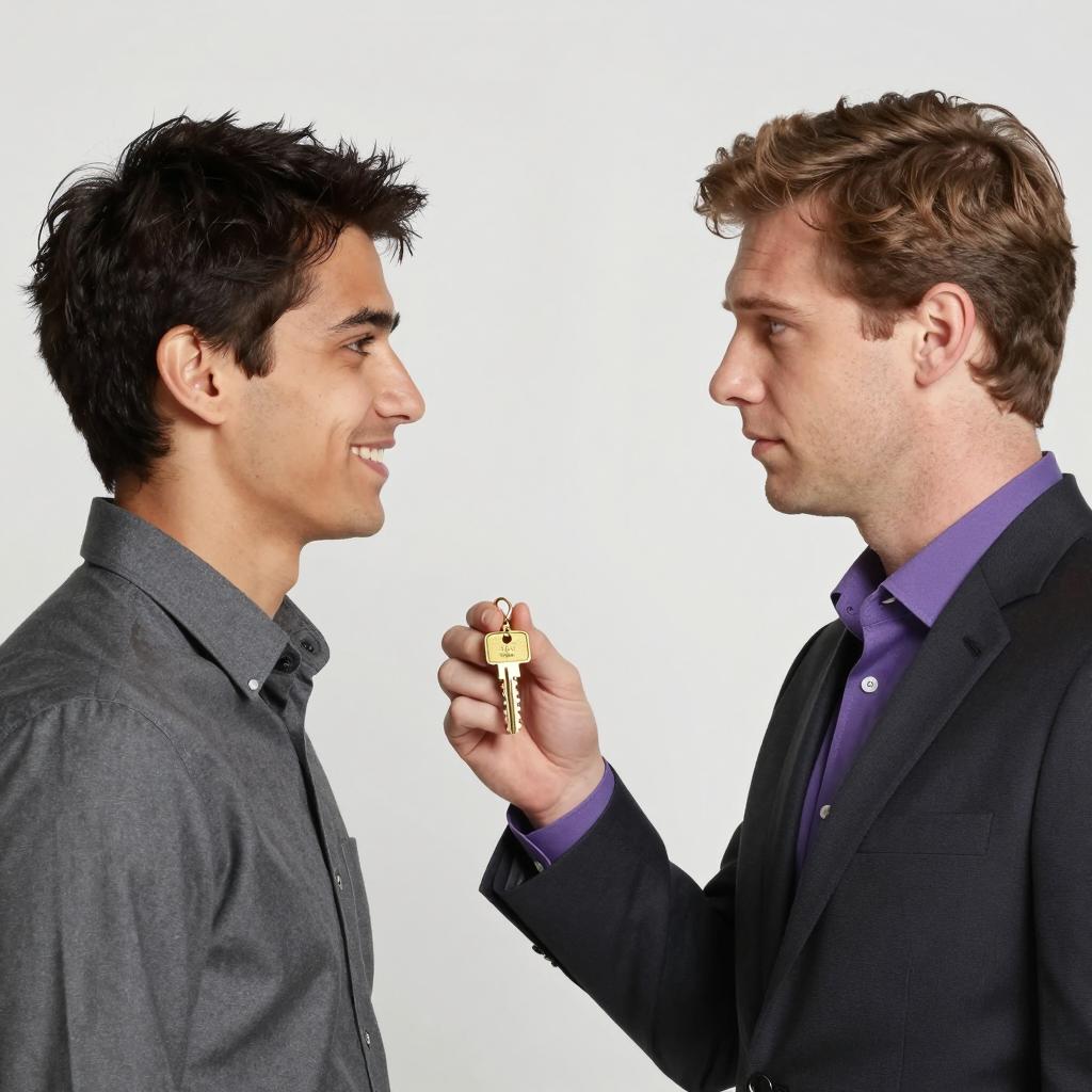 Two men, both in profile. Man on left, short dark hair, light skin, smiling, wearing gray shirt. Man on right, light brown hair, light skin, serious expression, wearing dark suit with purple shirt, holding golden keys in right hand. White background.