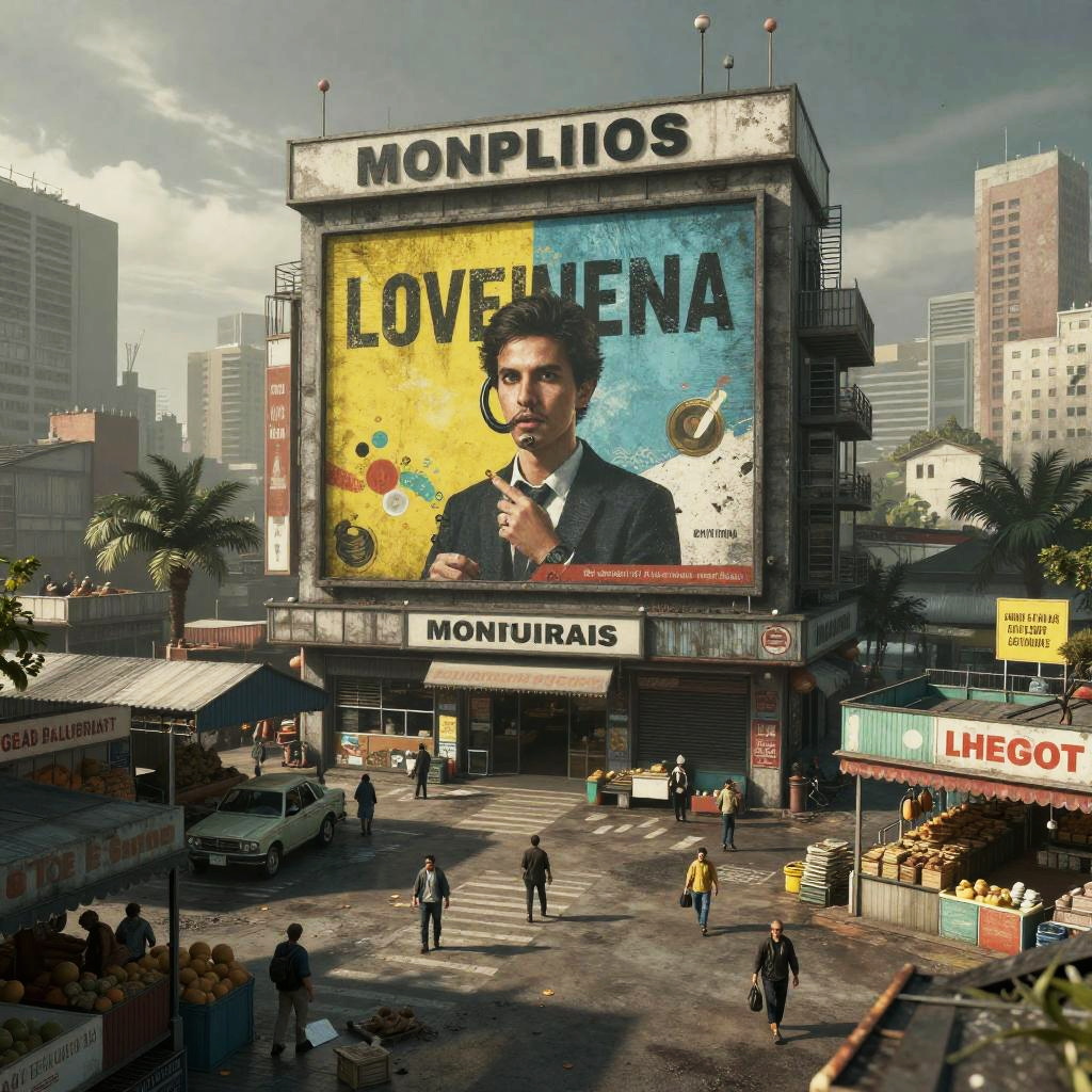 Monopolios represented in a dystopian marketplace where one massive company overshadows smaller businesses, gritty urban environment, faded colors with splashes of bright advertising, highlighting economic imbalance and social tension