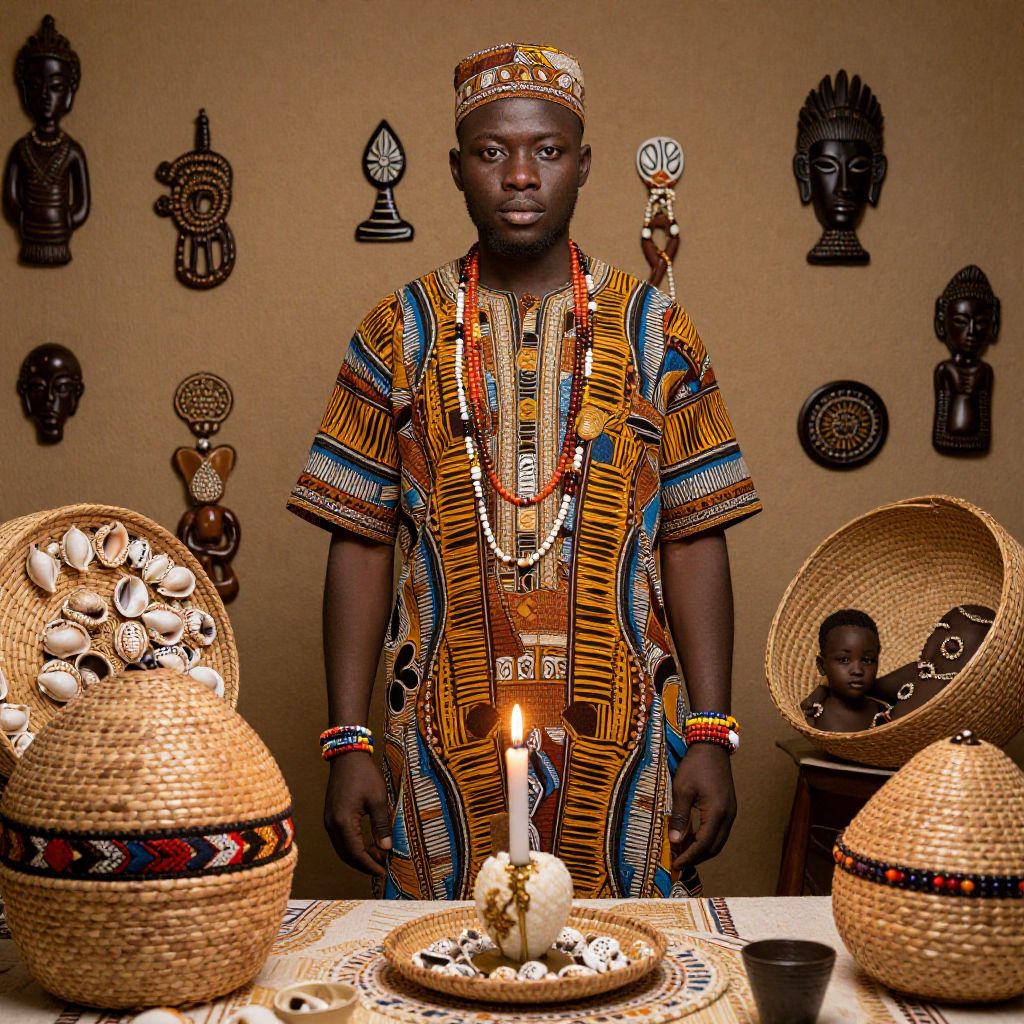 Photograph of a dark-skinned African man in colorful traditional attire, standing between woven baskets with shells, candles, and baby dolls, in a room