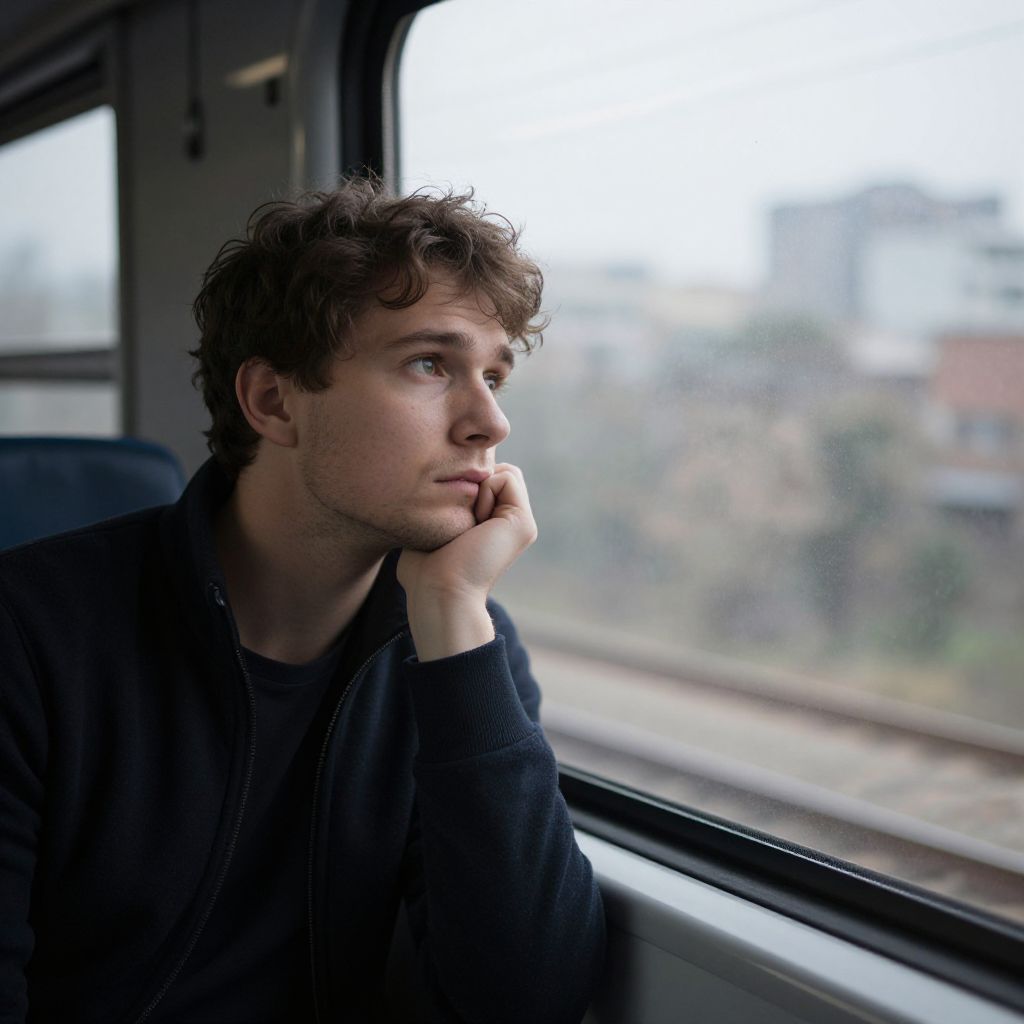 Photograph of a young man with curly brown hair, wearing a black jacket, seated in a train, gazing out the window thoughtfully. Bl