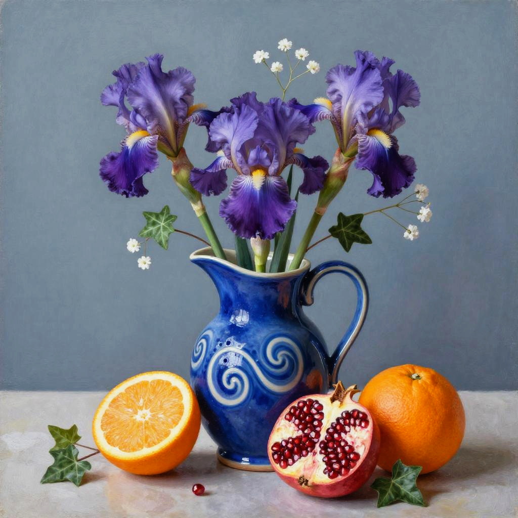 A still life painting of a glazed cobalt blue ceramic pitcher with white swirl patterns brimming with purple irises, baby’s breath, and green ivy tendrils. In front rest a sliced orange with seeds, a halved pomegranate, and a whole orange on a clean surface; the muted slate blue backdrop keeps focus on form and color. Warm, balanced composition, soft natural light, gentle shadows, crisp edges, high detail, tasteful negative space, editorial quality, SDXL ready.