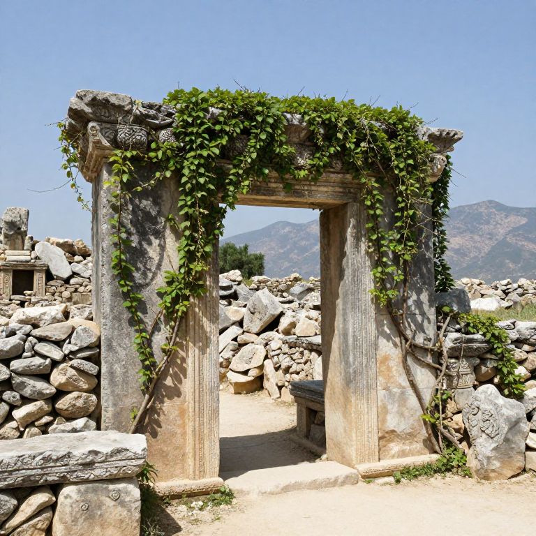 Photograph of an ancient Roman-style stone archway, partially covered in green ivy, set against a clear blue sky. The archway, with fluted columns, stands amidst a rubble of white and grey rocks. In the background, distant mountain peaks are visible. The sunlight casts shadows, emphasizing the texture of the weathered stone. The scene evokes a sense of historical decay and natural reclamation. The image captures a balance between ancient architecture and the encroaching greenery.