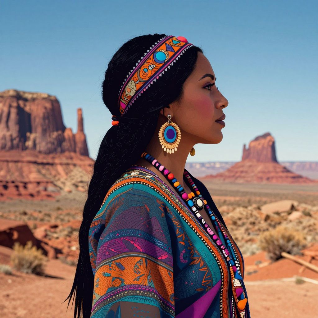 A stylized silhouette of a Navajo woman in profile against the backdrop of Monument Valley, with vibrant colors and textures layered over the image.