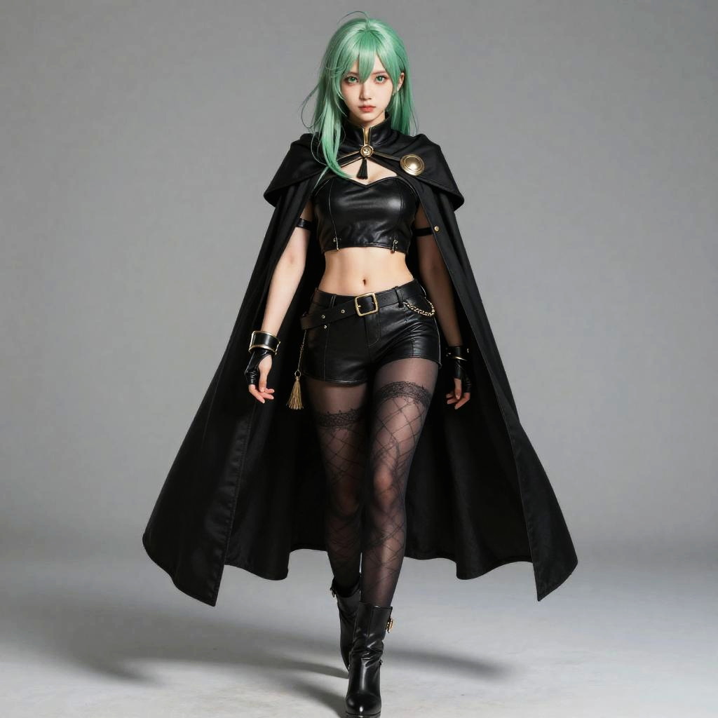 Photograph of a woman with green hair, wearing a black leather crop top with a keyhole cutout, black leather shorts, and a long black cape. She has black lace-patterned stockings and black boots. Her outfit includes black fingerless gloves with gold accents and a black choker. The background is a plain, light gray studio setting. She stands confidently, looking directly at the camera with a serious expression. The lighting is bright, highlighting her outfit's textures and details.