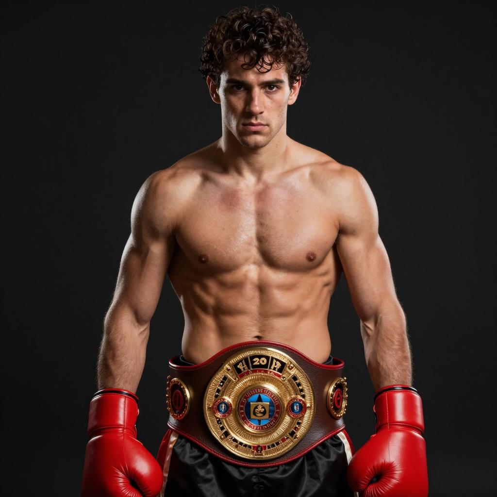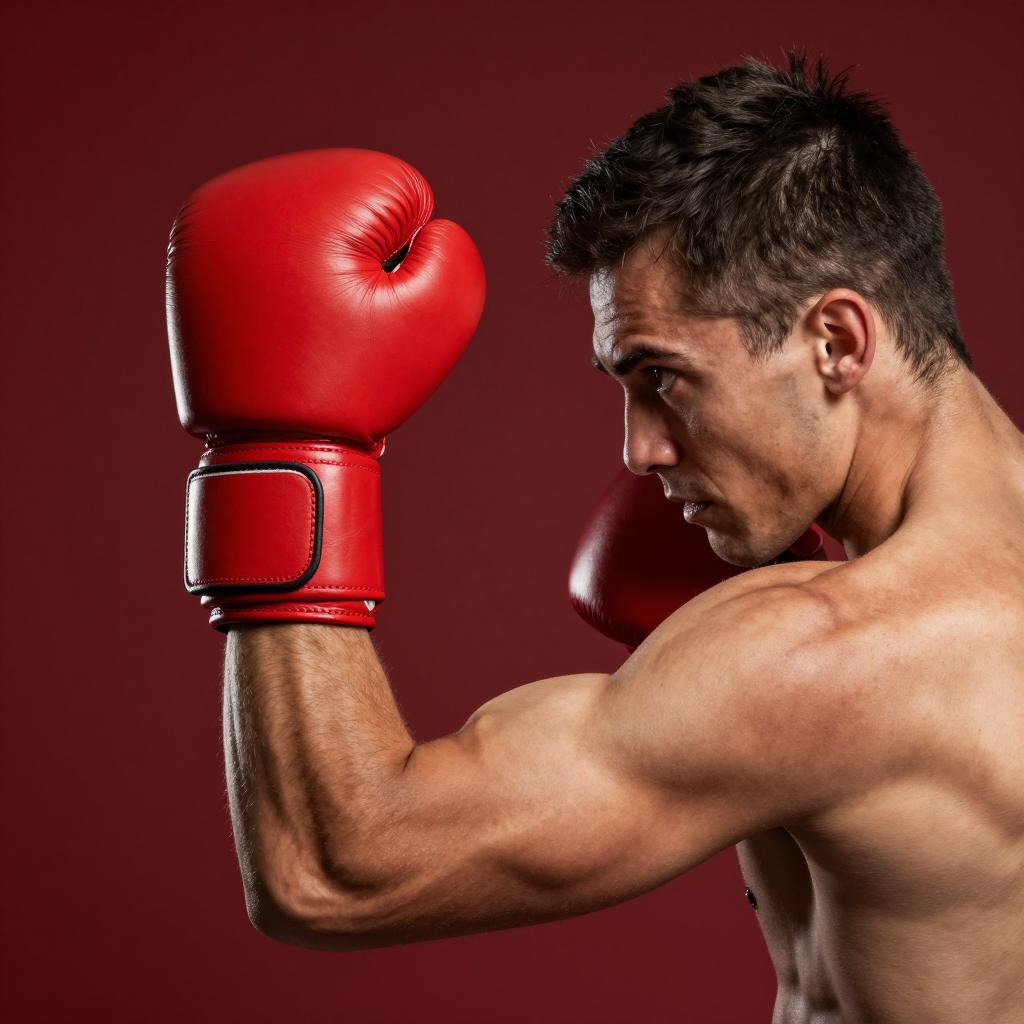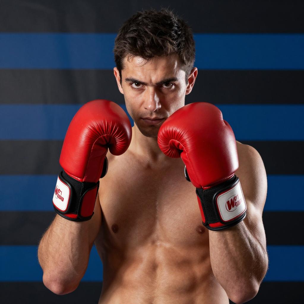 Muscular, shirtless man with dark hair, wearing red boxing gloves, against blue and black striped background. He has a serious expression, arms slightly raised. Background has ured, rough appearance. Man centered in the frame.