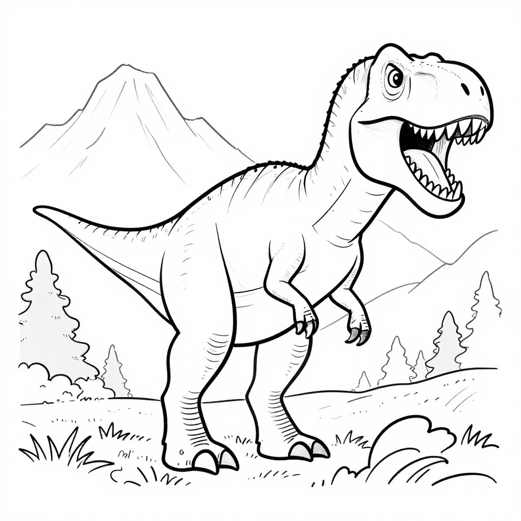 Black and white cartoon drawing of a roaring dinosaur with sharp teeth, standing in a grassy field with mountains and trees in the background.