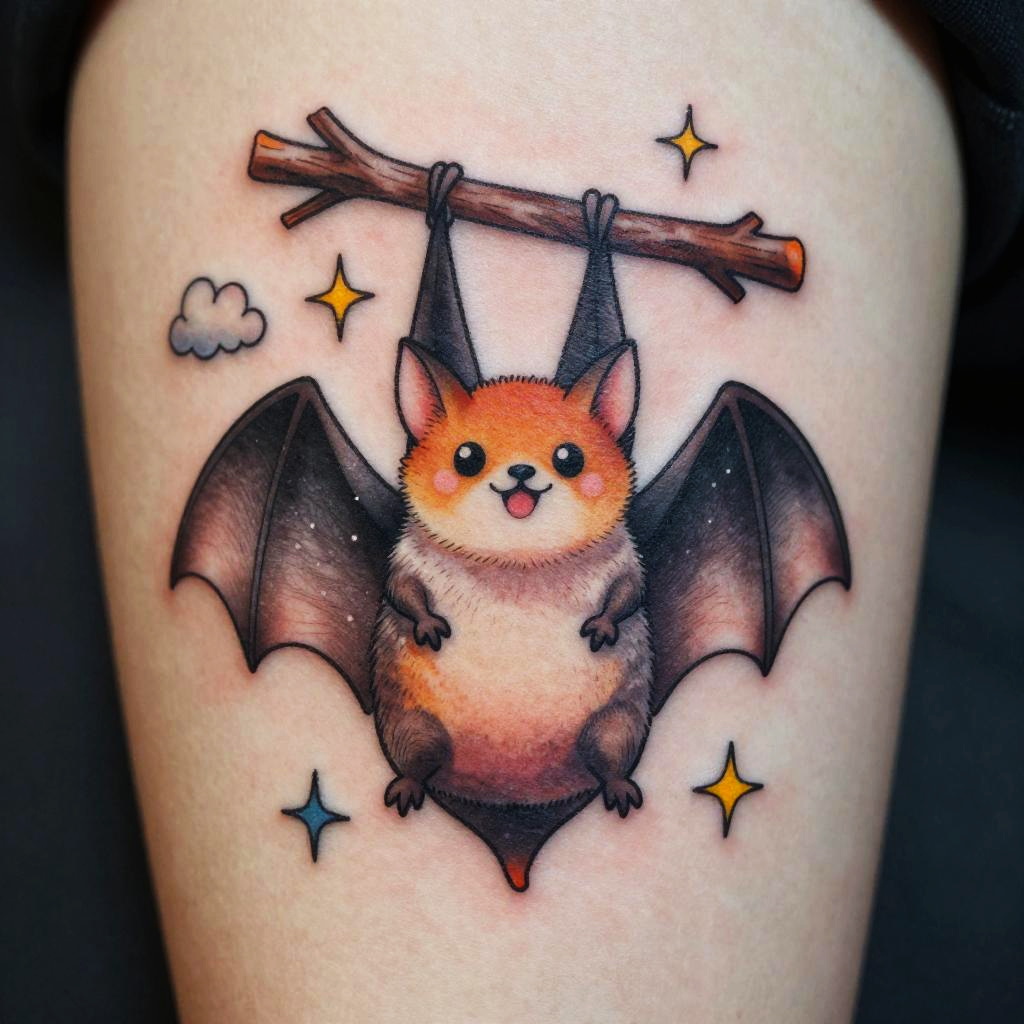 Cute bat tattoo illustration, vibrant and joyful, showing a chubby bat hanging upside down from a branch, colored with warm tones and smooth gradients, combined with simple celestial patterns like stars and clouds, ideal for a small back or calf tattoo.