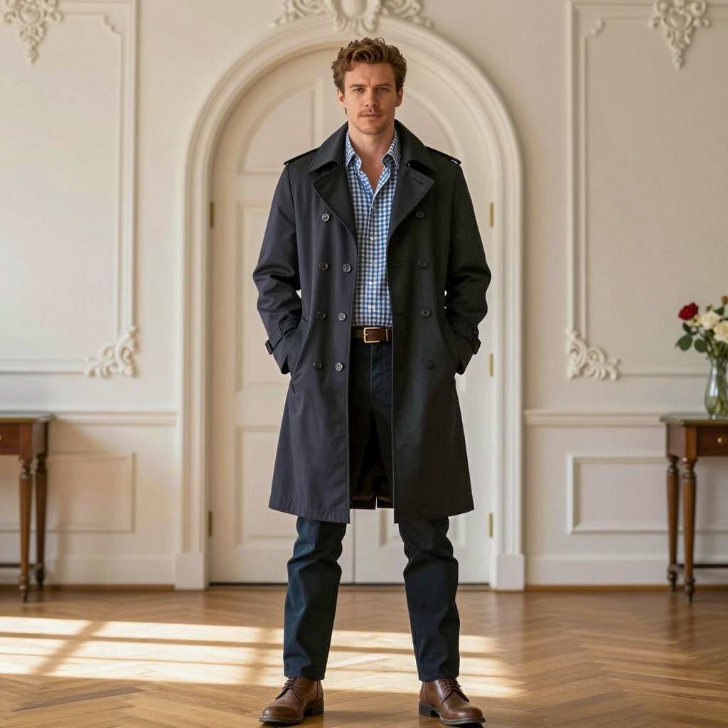 Costume movie character, photograph of a handsome man, standing in an ornate room, full body shot, looking serious, wearing a dark gray overcoat, brown vest, white shirt, gray pants, black belt, orange dress shoes, dark brown hair, clean-shaven, elegant background with gold and brown paneling, marble floor, realistic, detailed, subtle lighting, sophisticated style, realistic ures, vintage atmosphere, formal attire, centered, vertical orientation, portrait format