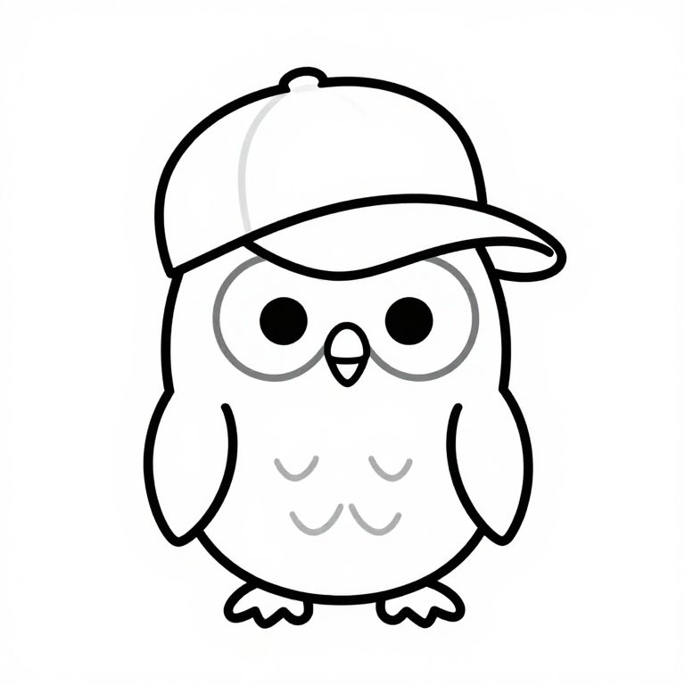 Black and white cartoon owl wearing a baseball cap, with large round eyes, small beak, and simple wings and feet, standing upright.