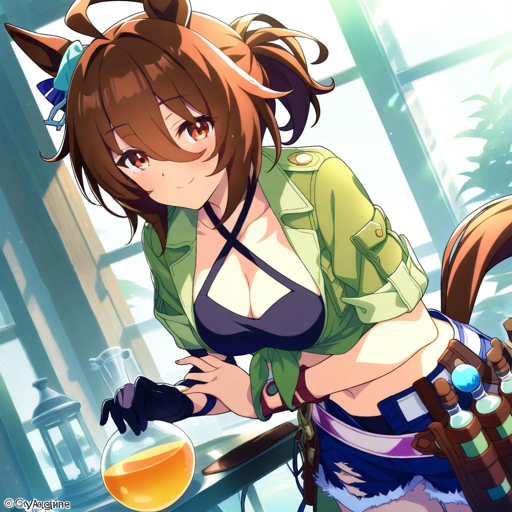 Agnes tachyon (lunatic lab) (umamusume), umamusume, 1girl, horse girl, horse ears, horse tail, ear ornament, hair between eyes, red eyes, brown eyes, brown hair, short hair, official alternate hairstyle, ahoge, short ponytail, medium breasts, cleavage, navel, black bikini, green jacket, tied jacket, black gloves, open shorts, denim shorts, criss-cross halter, open fly, single glove, round-bottom flask, by artist saipaco, animagine