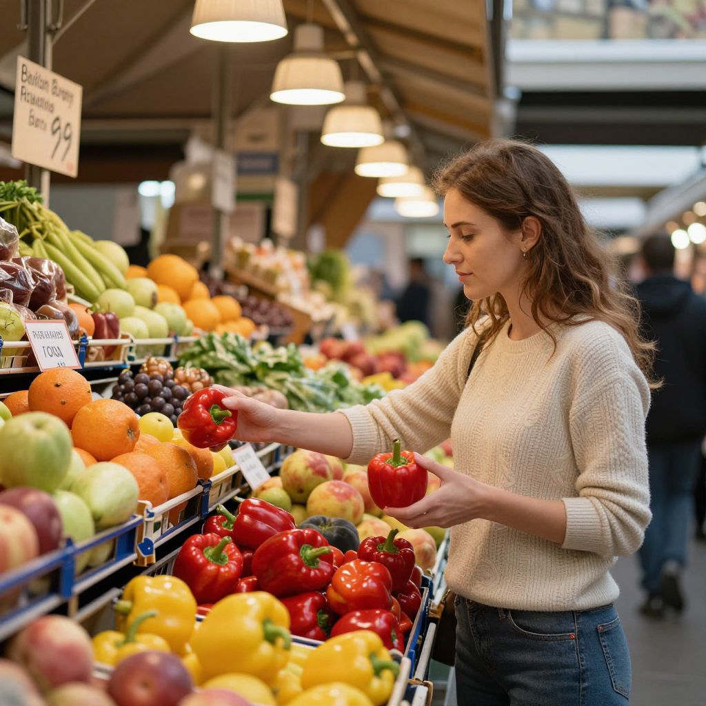 Photograph of a brunette woman in a cream sweater, selecting red bell peppers at a vibrant, colorful market stall.