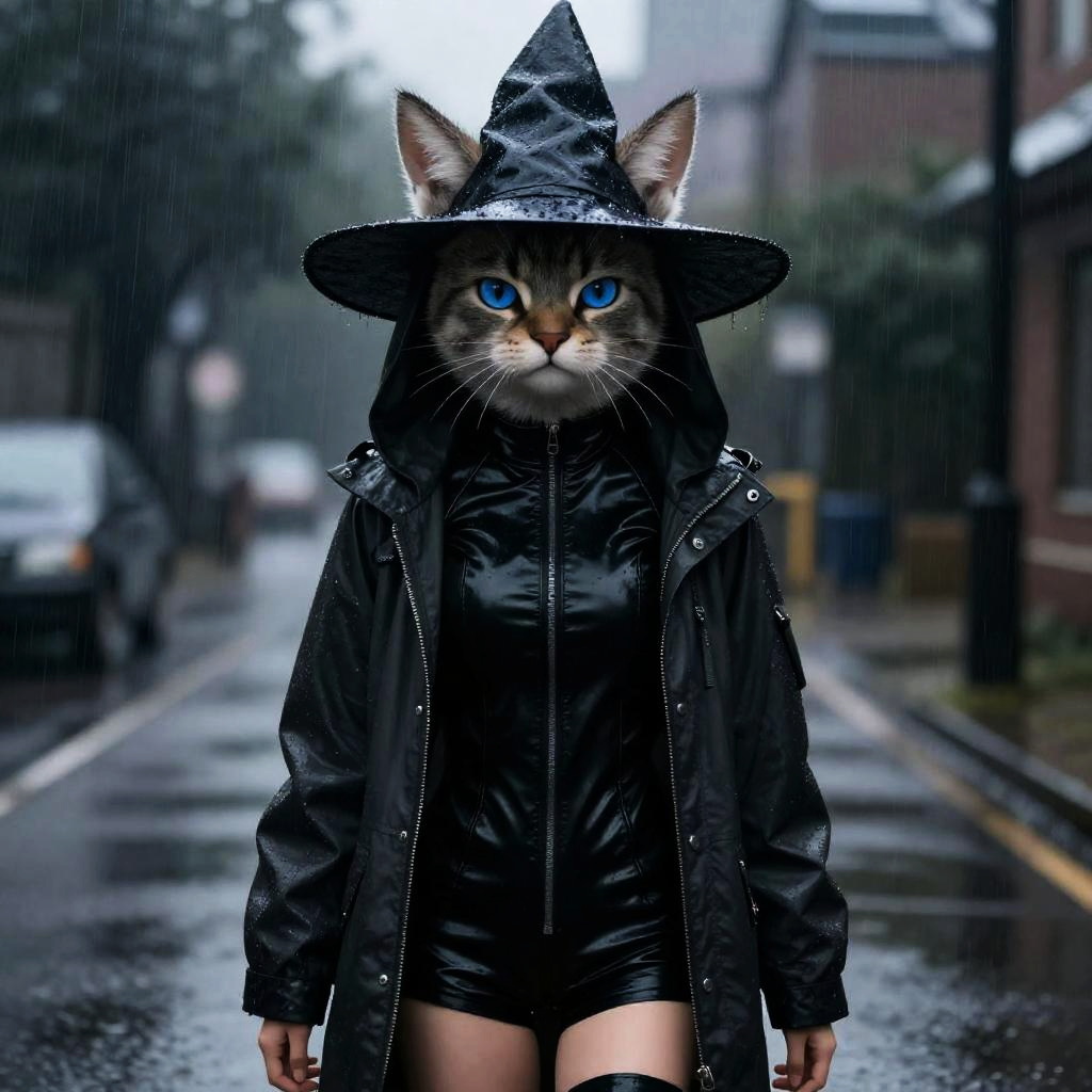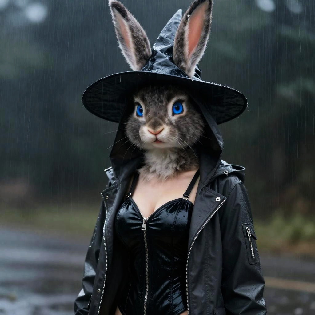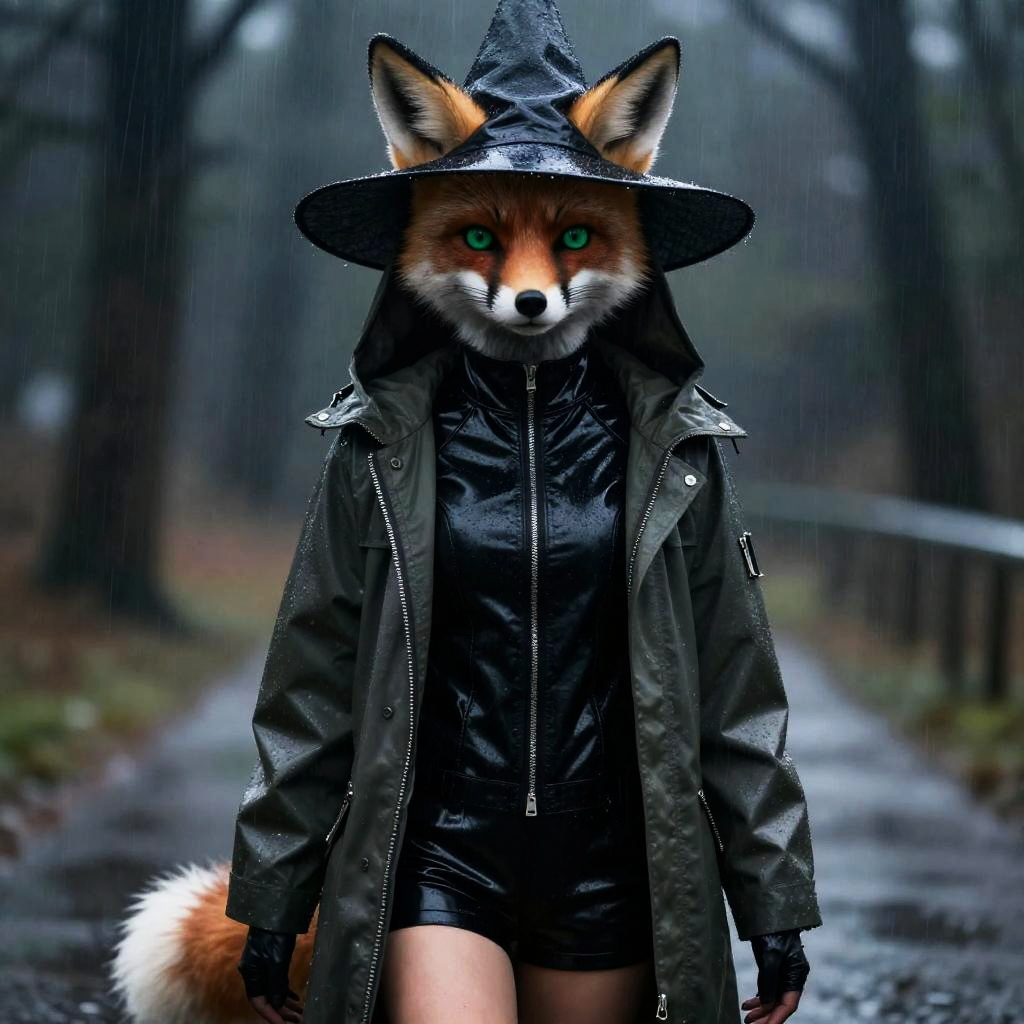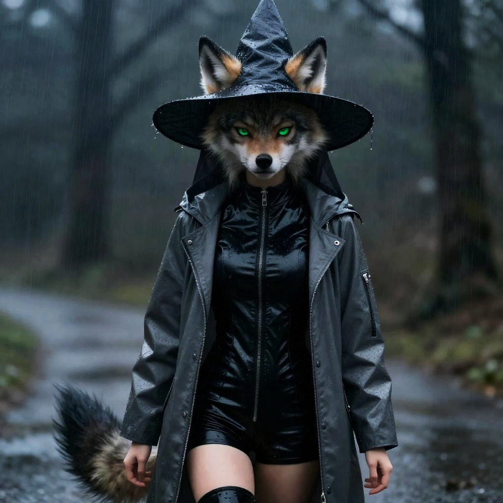 Furry girl, masterpiece, best quality, solo, rain, hood, animal ears, furry, hood up, 1girl, jacket, full body, hooded jacket, closed mouth, whiskers, raincoat, fox, furry female, wolf ears, green eyes, full body, medium breast, hentai waifu, witch hat, black latex clothes, photorealistic