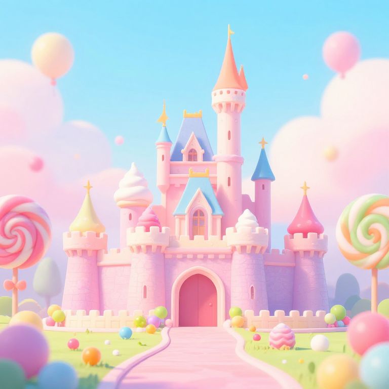 Candy store aesthetic with a magical, fairytale feel, overflowing candy bowls, fairy lights hanging, cotton candy clouds, sugary textures, soft pastel hues, dreamlike setting
